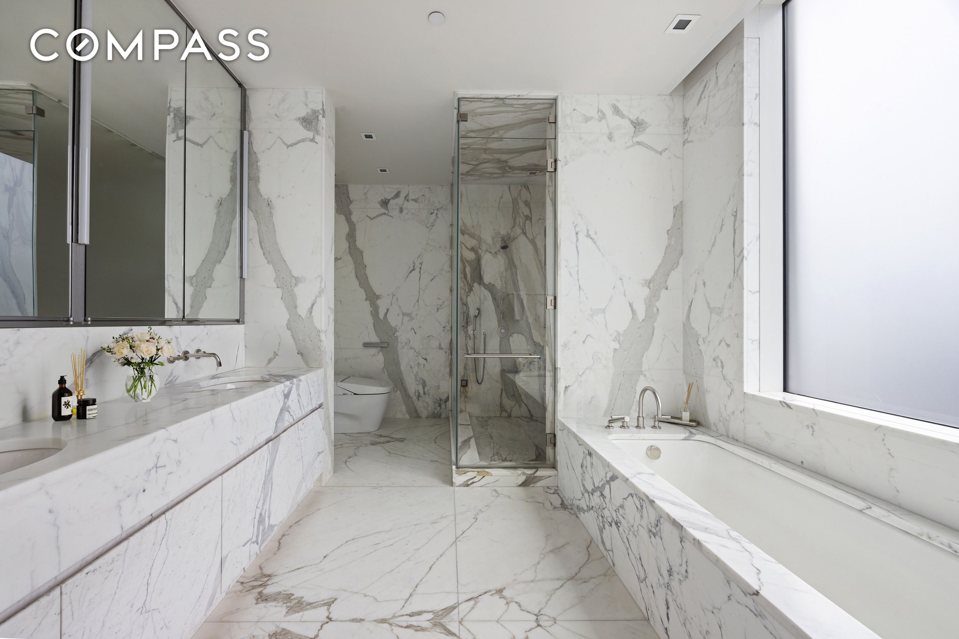 Separated from the rest of the home, the primary suite includes a private terrace and a large dressing area. The en-suite bath is appointed with a double vanity, radiant heating floors, soaking tub, and glass-enclosed shower.