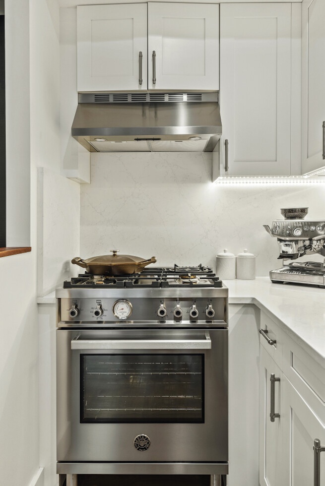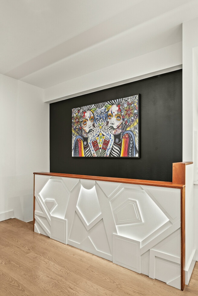 The entry foyer opens to a custom staircase with integrated lighting, setting the tone for the rest of the home. The kitchen has been fully rebuilt around Bertazzoni and Bosch appliances, a double-door refrigerator/freezer, and Viatera quartz countertops with a custom backsplash. The dining area features a live-edge oak and epoxy resin table built from imported Turkish wood. Front windows are one-way wrapped - fully private from the street, unobstructed from inside.
