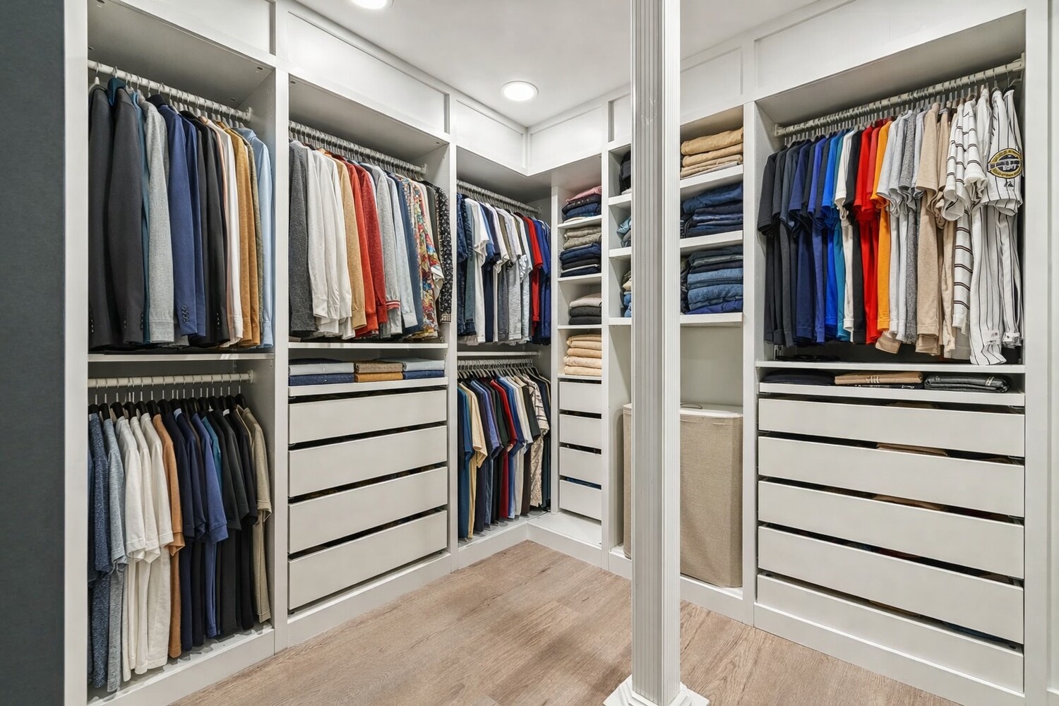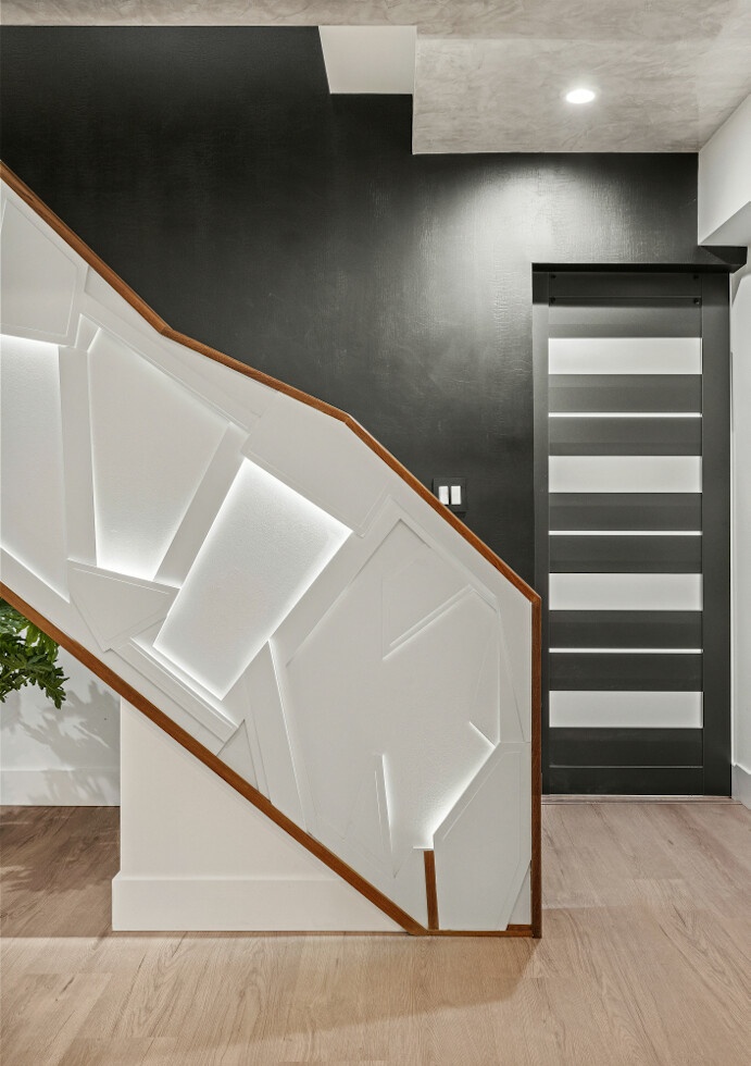 Downstairs, the red oak staircase - a functional sculpture in its own right - leads to an oversized primary suite with soaring ceilings finished in Venetian marble plaster. The room is anchored by a sunken oak bed with custom nightstands, a dark snakeskin plaster feature wall, and Philips Hue lighting with Sonos speakers and a dedicated amp. A spacious walk-in closet with built-ins, full-wall mirrors, and a frosted European barn door sits off the suite, along with remote-controlled Hunter Douglas shades. Additional flex space beneath the staircase works well as a home office or gym.