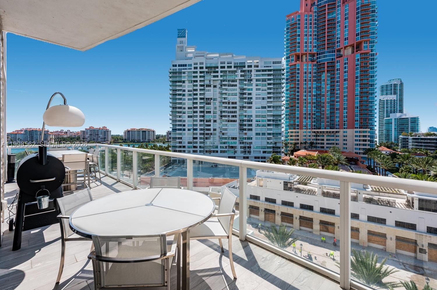 Southwest exposure fills the home with natural light, while three expansive open balconies on a unique transition level (no overhead ceilings) create multiple outdoor living spaces, including a striking marble bar table for al fresco gatherings.