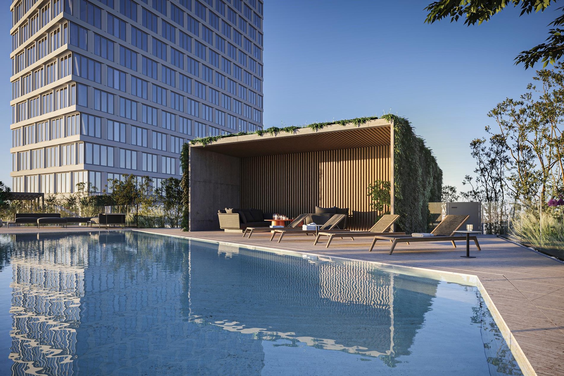The building's amenities include a bright fitness center, game room, golf simulator, coworking lounge, conference rooms, rooftop sun deck, and a private outdoor pool located on the fifth floor. The building also offers bike storage, and private storage cages for rent– with a door person present seven days a week from 11AM to 7PM.