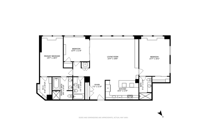 Step into a world of style and comfort in the heart of Chelsea at 130 West 30th Street, Unit 8C, where pre-war charm meets modern convenience. This stunning high-rise condo offers an exceptional living experience with a spacious layout of 2,064 sq ft, featuring three bedrooms and three baths arranged on a Solo level. The unit is bathed in natural light, with south and west exposures offering captivating river views that enhance your daily living. The open-concept living and dining area presents a harmonious blend of conventional elegance and modern luxury, with gleaming hardwood floors and impressive pre-war details. The kitchen is a chef's delight, complete with an eat-in design, a sleek center island, and top-of-the-line appliances, including a Bosch washer/dryer conveniently located in-unit. This space is truly designed to accommodate and impress, whether you're hosting a dinner party or enjoying a quiet evening at home. Each bedroom is generously sized, offering ample closet space for all your storage needs. The bathrooms are impeccably maintained, providing a sanctuary-like atmosphere. Central cooling ensures a comfortable environment throughout the year, tailored to your personal comfort.