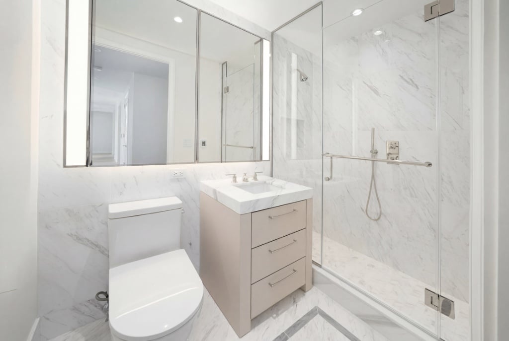 The bathroom is beautifully appointed with a custom vanity, marble finishes, and refined detailing for a timeless, spa-like feel. Additional highlights include an in-unit washer and dryer and smart thermostats.