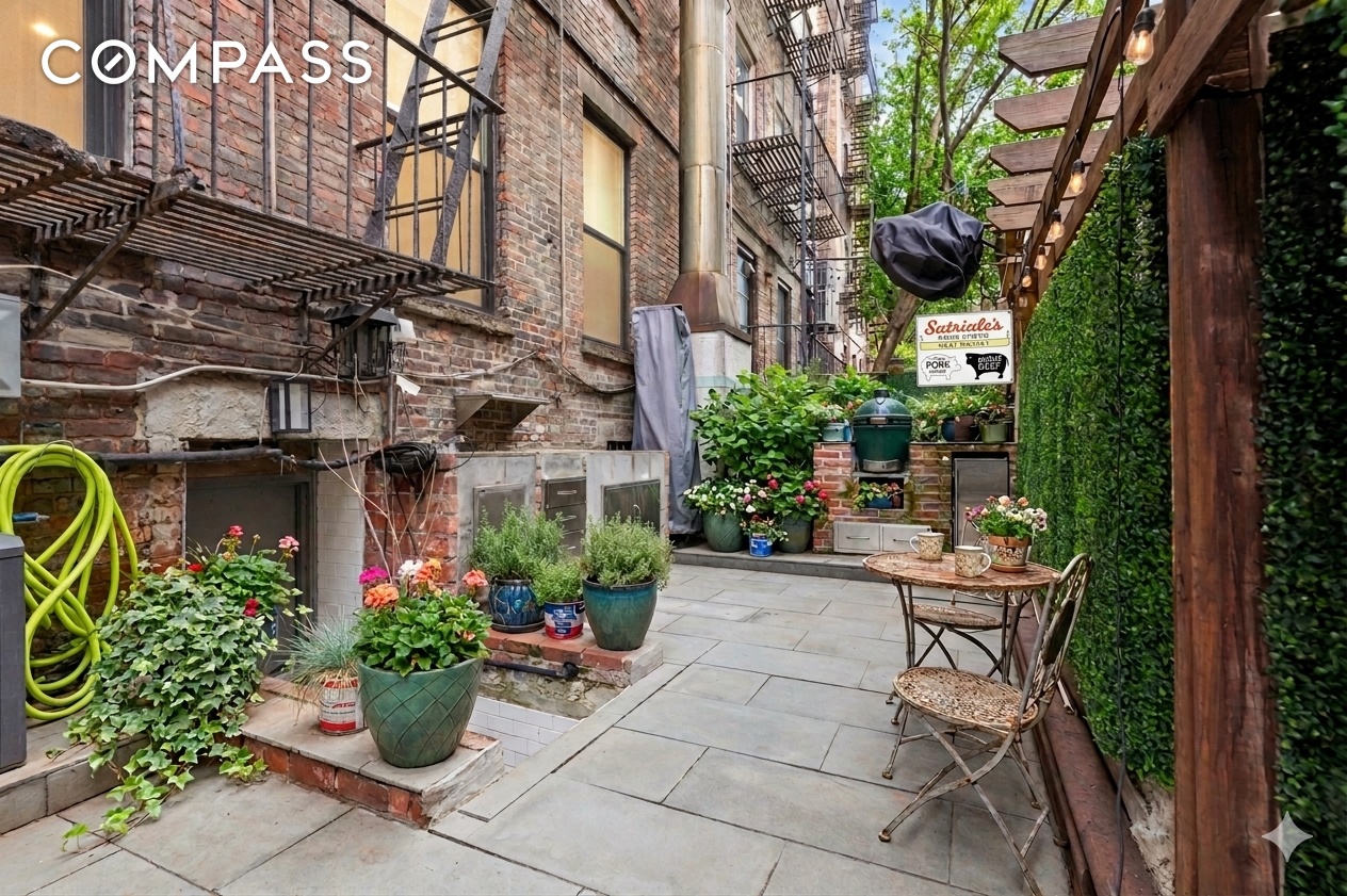 Rarely found in the city, this apartment boasts a private patioed garden. This true outdoor "room" is equipped with a outdoor kitchen, making it the ultimate setting for al fresco dining and entertaining against a backdrop of lush greenery and classic brick.