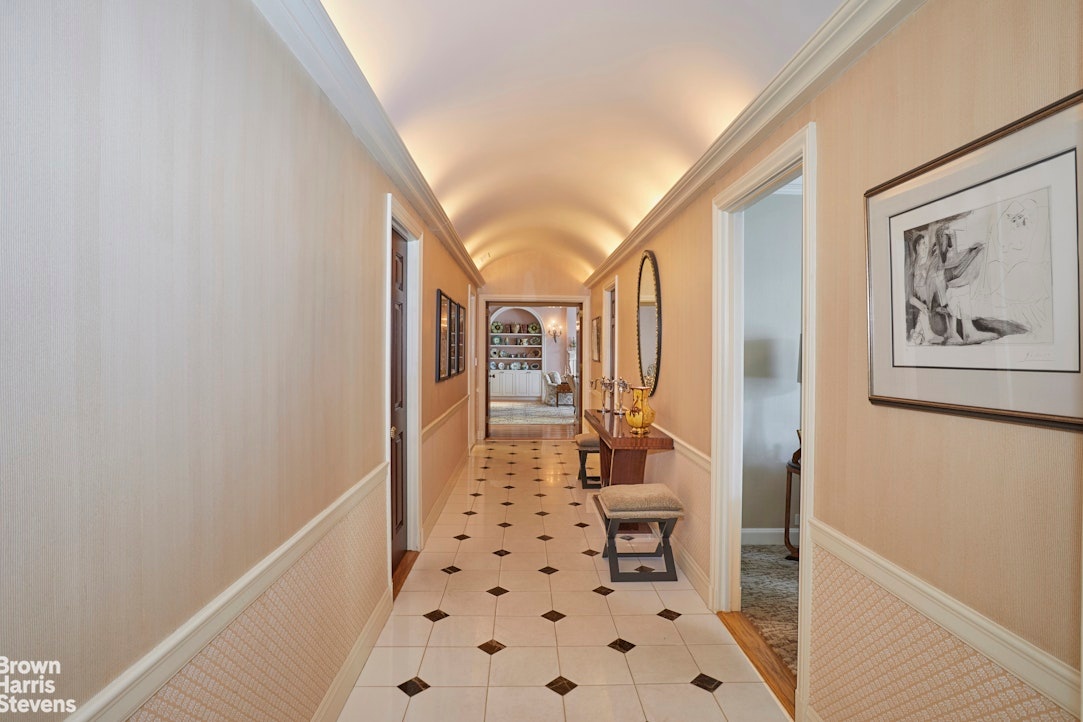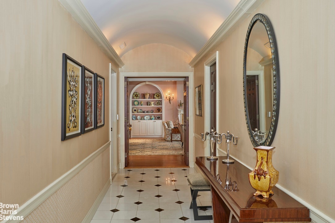 Arriving via a semi-private landing, the home opens to a gracious 35-foot gallery adorned with barrel-vaulted ceilings and refined cove lighting-an impressive introduction to the space. Beyond, a generously proportioned living room is bathed in natural southern light and anchored by a beautiful gas fireplace.