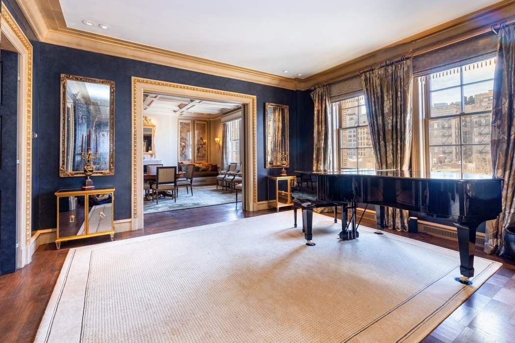 areas of the apartment. The impressive 17' x 37' double living room, includes the former music room which, along with the formal dining room, creates an elegant enfilade for gracious entertaining with nine oversized windows. A library is also directly accessed from the gallery and a powder room is discretely positioned in the adjacent hallway.11' Ceilings throughout the apartment along with five wood burning fireplaces, further enhance the impressive proportions, light and sheer volume of the rooms. Also accessed from the gallery is a vast eat-in kitchen with breakfast room and well-designed laundry area. large east and south-facing windows flood light into this area and there is direct access to a staff room with full bathroom.
