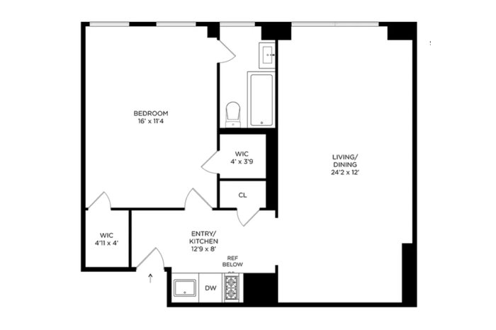 The bedroom offers open city views, two large closets, and an en-suite bathroom with a shower/tub.