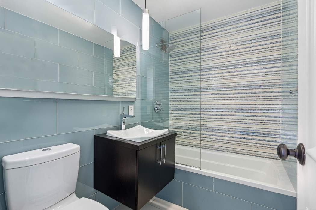 The en-suite primary bath is beautifully appointed with Hansgrohe fixtures, Ronbow double sinks and Robern medicine cabinets, and elegant finishes by Artistic Tile and Ann Sacks, complemented by white marble floors. The second bathroom, conveniently located off the hall, functions perfectly as a powder room and features a Robern medicine cabinet, Ronbow vanity, and striking tilework.