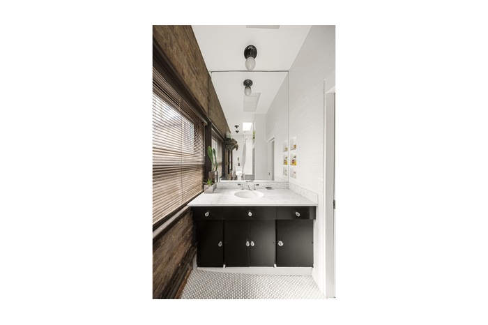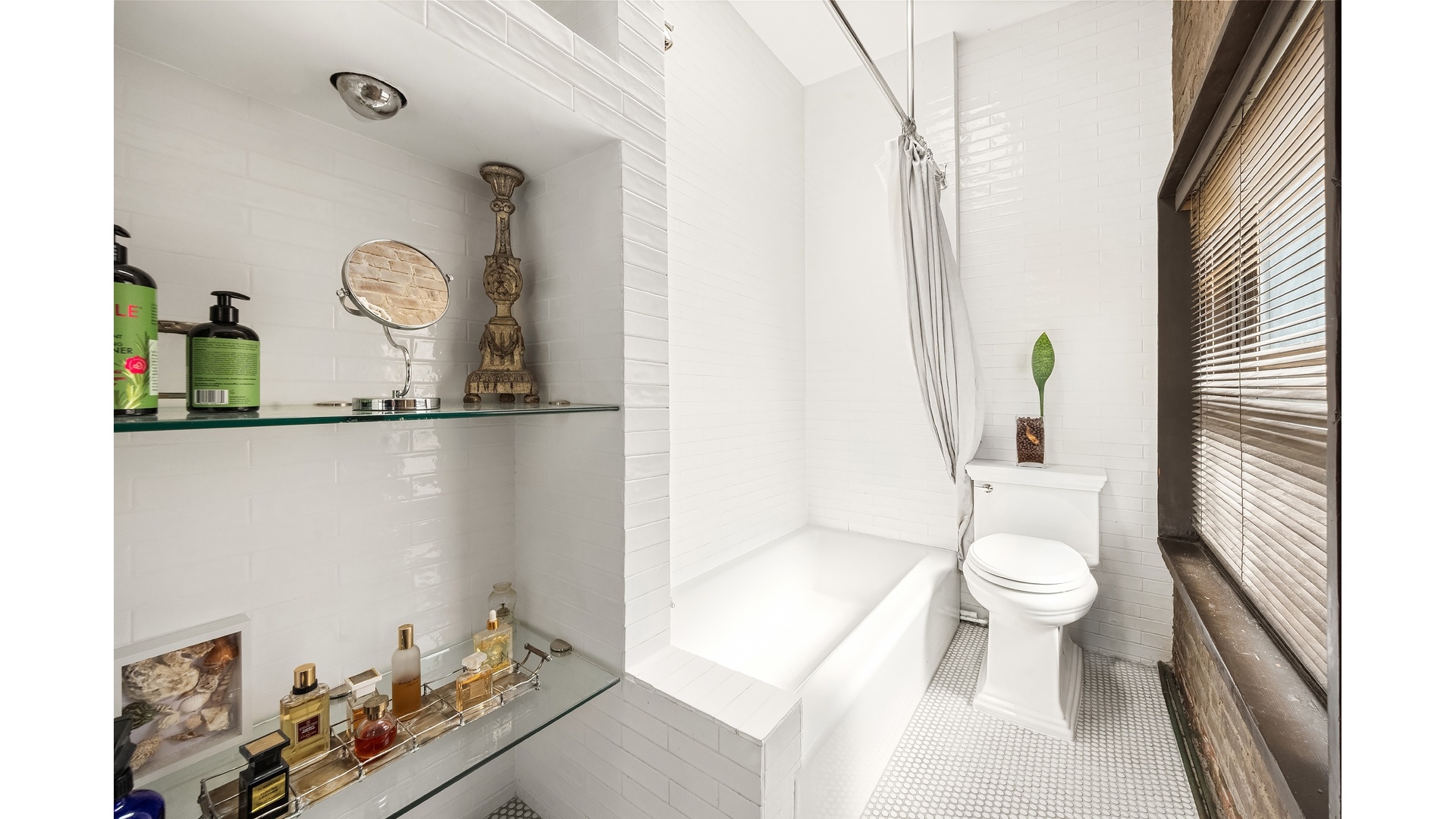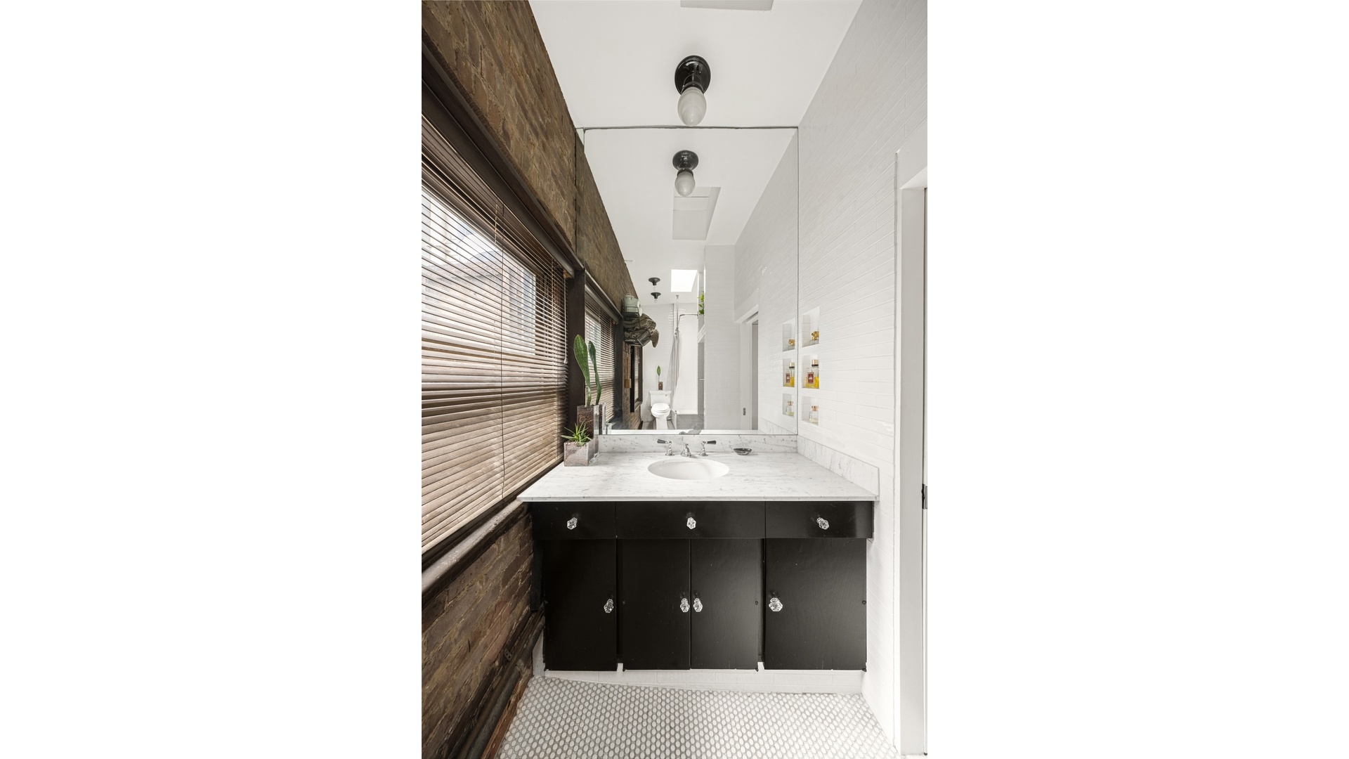 Tucked quietly at the rear, the spacious south-facing bedroom offers a peaceful retreat with ample closet space, soft natural light, and continued exposed brick detailing. The bathroom features Lefroy Brooks fixtures in nickel, providing a timeless and elegant finish.