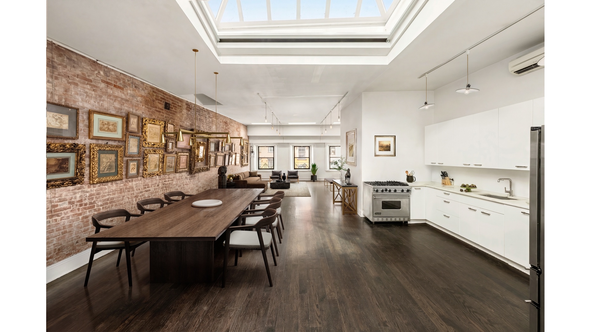 The oversized living and dining area features a 12-foot cathedral skylight with a motorized shade. Additional skylights in the bedroom and bathroom enhance the loft's bright, airy atmosphere and highlight exposed brick walls that add warmth and timeless charm. The open kitchen integrates seamlessly with the space and features a commercial-grade Viking range, making it well suited for both everyday living and entertaining. Modern conveniences include an individually controlled HVAC system and an in-unit washer/dryer.