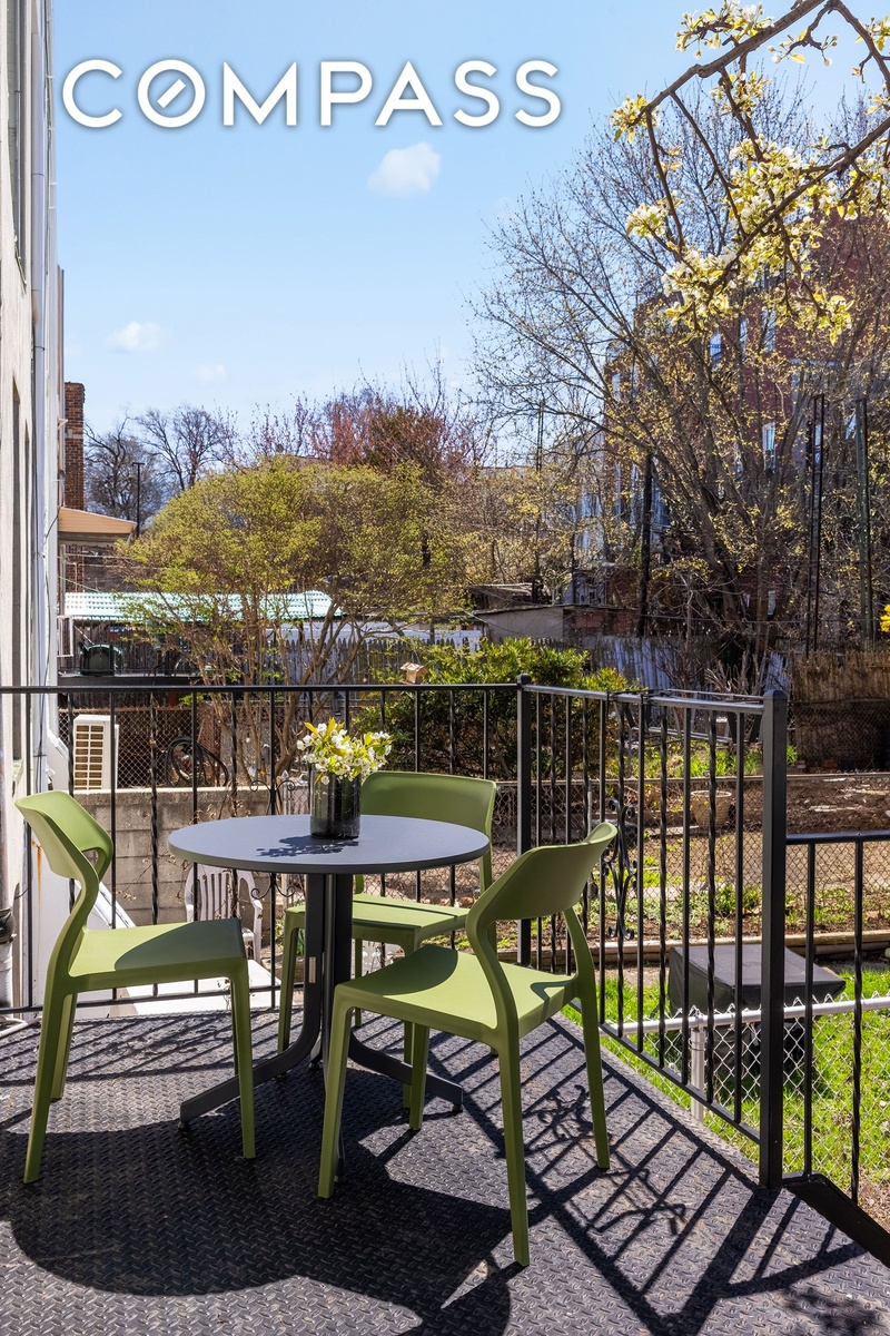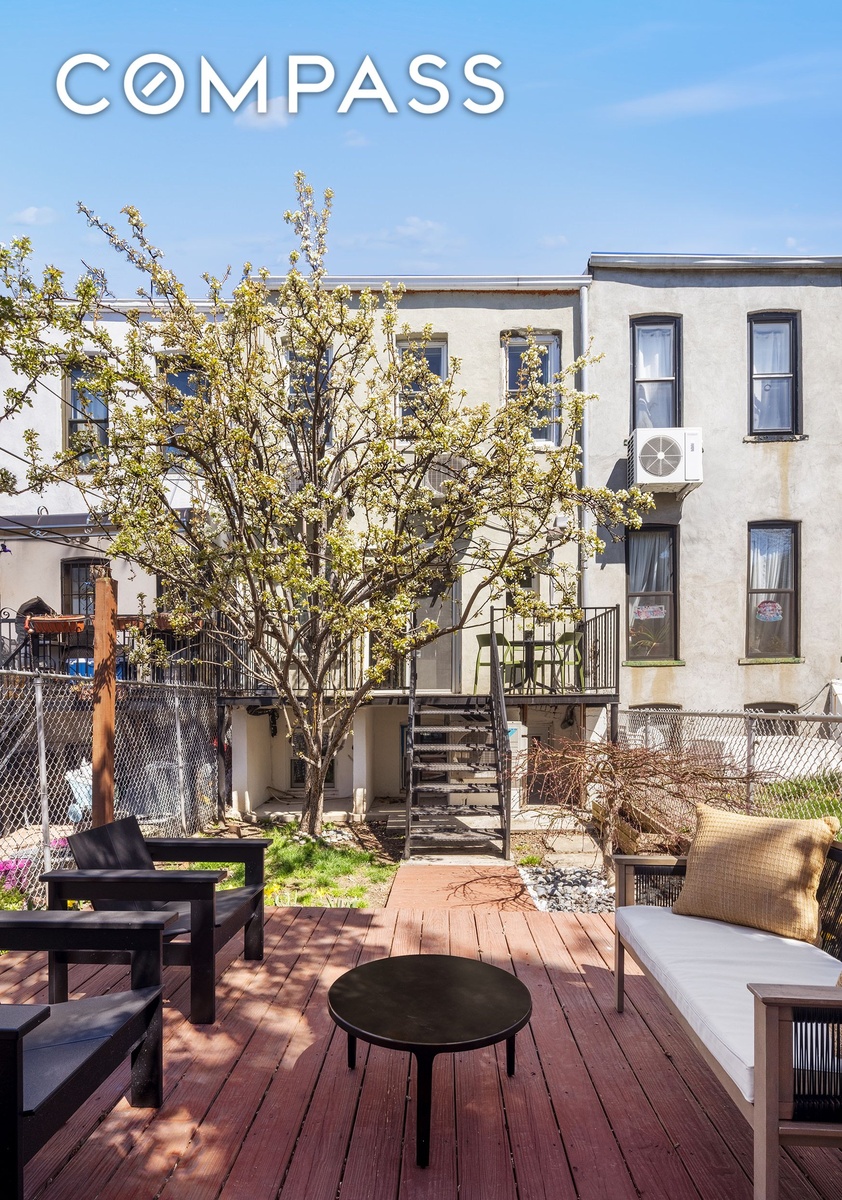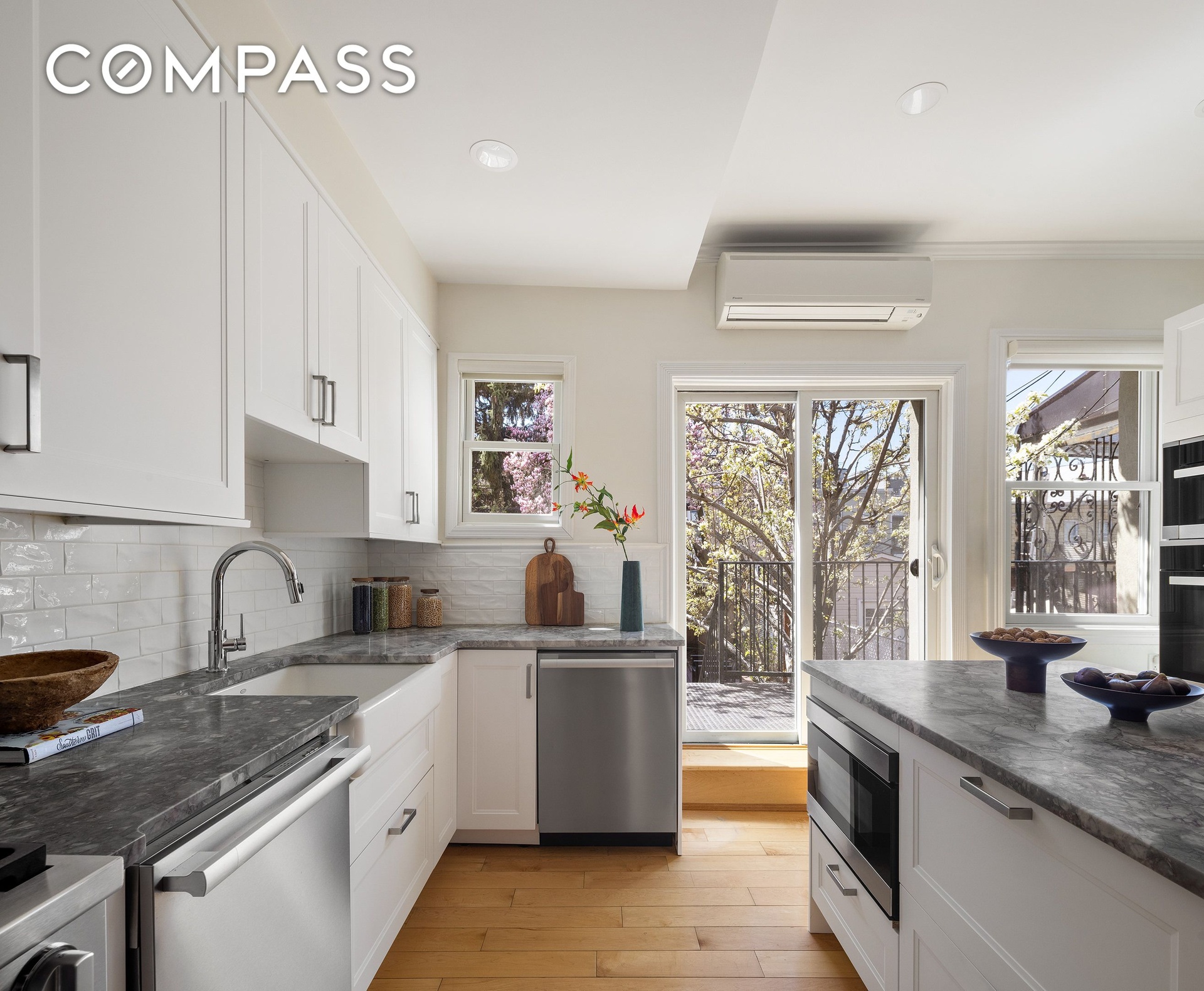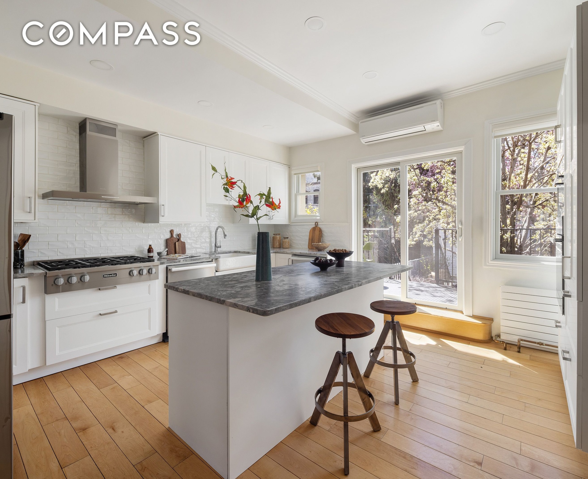 Step inside to be greeted by gleaming hardwood floors and exposed brick, setting a warm, inviting tone. The open-concept main floor flows effortlessly from the airy living and dining areas to the chef's kitchen—a true showstopper. Outfitted with top-of-the-line Miele appliances, including a six-burner gas stove, double ovens (one a steam oven), and two dishwashers, as well as quartzite countertops and a ceramic sink, this space is as functional as it is beautiful. A rear deck off the kitchen leads to a serene garden complete with a blooming magnolia tree, offering a private oasis in the city. A full tiled bathroom off the living room completes this level.