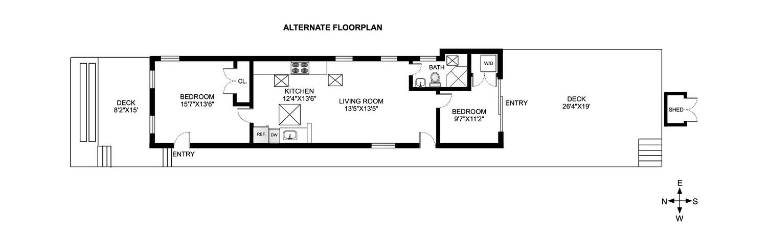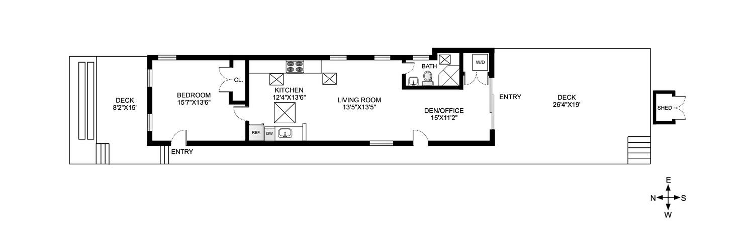 Step into this beautifully renovated home, where an open floor plan and soaring vaulted ceilings create a bright, airy ambiance filled with natural sunlight. The spacious living room features three large windows and a skylight, seamlessly flowing into the modern open kitchen that is equipped with stainless steel appliances, ample counter space, two walls of cabinets and a huge skylight. The generous bedroom features three oversized windows, a double closet, and a private entrance leading to the inviting front deck. A versatile bonus space beyond the living room can easily be transformed into a second bedroom, with large sliding doors opening onto a sizable back deck that extends over 26 feet. This outdoor retreat features a partial awning, ideal for relaxing in the shade or soaking up the sun. Additional highlights include a full bathroom with a skylight, split heating and cooling for year-round comfort, a handy outdoor storage shed, and generous storage options beneath the house. Don't let this one pass you by.