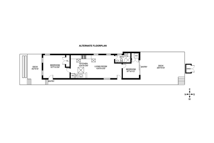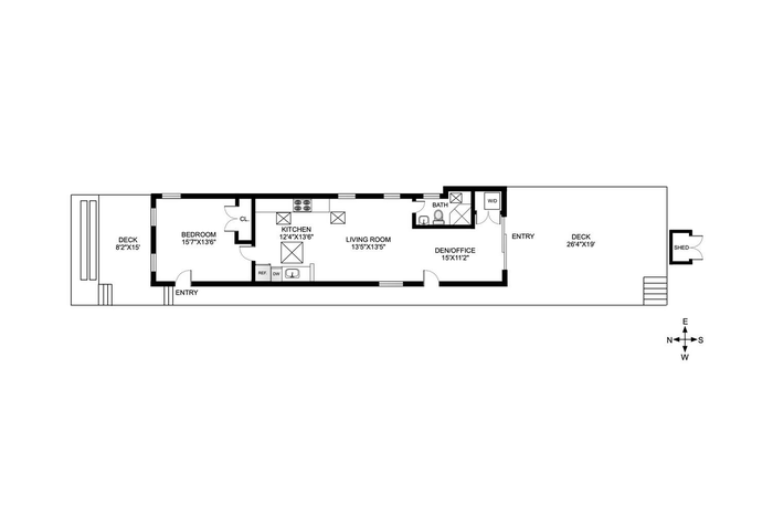 Step into this beautifully renovated home, where an open floor plan and soaring vaulted ceilings create a bright, airy ambiance filled with natural sunlight. The spacious living room features three large windows and a skylight, seamlessly flowing into the modern open kitchen that is equipped with stainless steel appliances, ample counter space, two walls of cabinets and a huge skylight. The generous bedroom features three oversized windows, a double closet, and a private entrance leading to the inviting front deck. A versatile bonus space beyond the living room can easily be transformed into a second bedroom, with large sliding doors opening onto a sizable back deck that extends over 26 feet. This outdoor retreat features a partial awning, ideal for relaxing in the shade or soaking up the sun. Additional highlights include a full bathroom with a skylight, split heating and cooling for year-round comfort, a handy outdoor storage shed, and generous storage options beneath the house. Don't let this one pass you by.