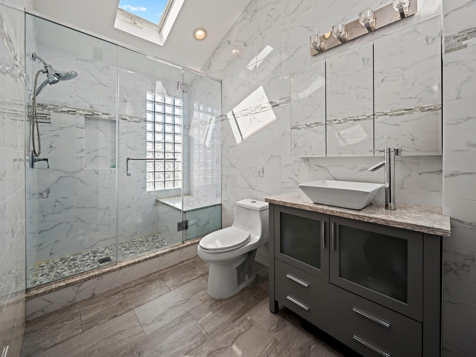 Classic center-hall Colonial, with the undeniable attraction of the South Shore of Staten Island, makes an immediate impression. An expansive 60-foot-wide corner property set on an impressive 6,300 SqFt lot. Bright, gracious, and beautifully proportioned, the home offers four bedrooms and four baths across three levels. Multiple outdoor spaces are virtually maintenance-free and designed for both everyday enjoyment and effortless entertainment. At the heart of the home, a chef's eat-in kitchen, complete with a Sub-Zero refrigerator and freezer, radiant heated floors, and abundant space for gathering. The main level also features a sprawling 20-foot formal living room, an elegant formal dining room, and a more relaxed den ideal for lounging or a substantial home office. Direct access to the private, paved, and gated garden creates a seamless indoor-outdoor lifestyle. The lower level dramatically expands the home's versatility, offering an additional floor of usable space. Perfectly suited for entertaining, complete with a wet bar, and perfect for a fitness area, media room, additional workspace, or comfortable guest quarters. Upstairs, the bedroom level is both serene and surprisingly private. The primary suite occupies the entire south wing, creating a true retreat behind a private door. Vaulted ceilings, a fireplace, and a dedicated seating area add warmth and scale, while the oversized spa-like bath features a glass-enclosed shower and jetted soaking tub. Exceptional closet space further enhances the suite. The north wing offers three additional bedrooms and a pristine skylit bath, thoughtfully designed for comfort and privacy. Additional highlights include solar panels for long-term efficiency, multi-zone central air and heating, an interior two-car garage, and a private driveway. Moments from Huguenot's parks, public transportation, and the renowned South Shore Golf Course, this is a standout South Shore offering that balances timeless design with modern living.