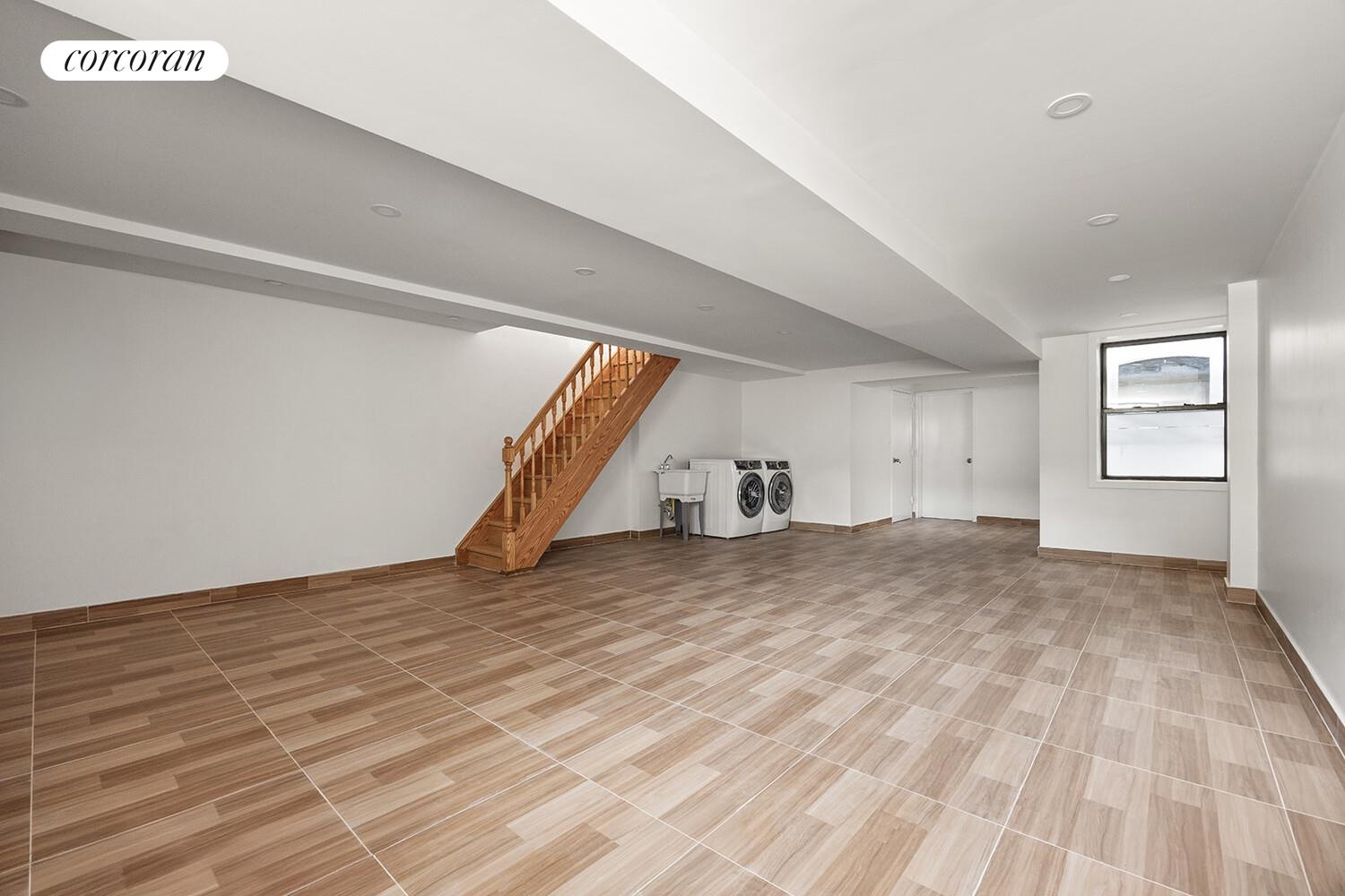 The lower level features a bright, windowed finished basement with tiled floors throughout, a full-size washer and dryer, slop sink, and direct access to the attached two-car garage.