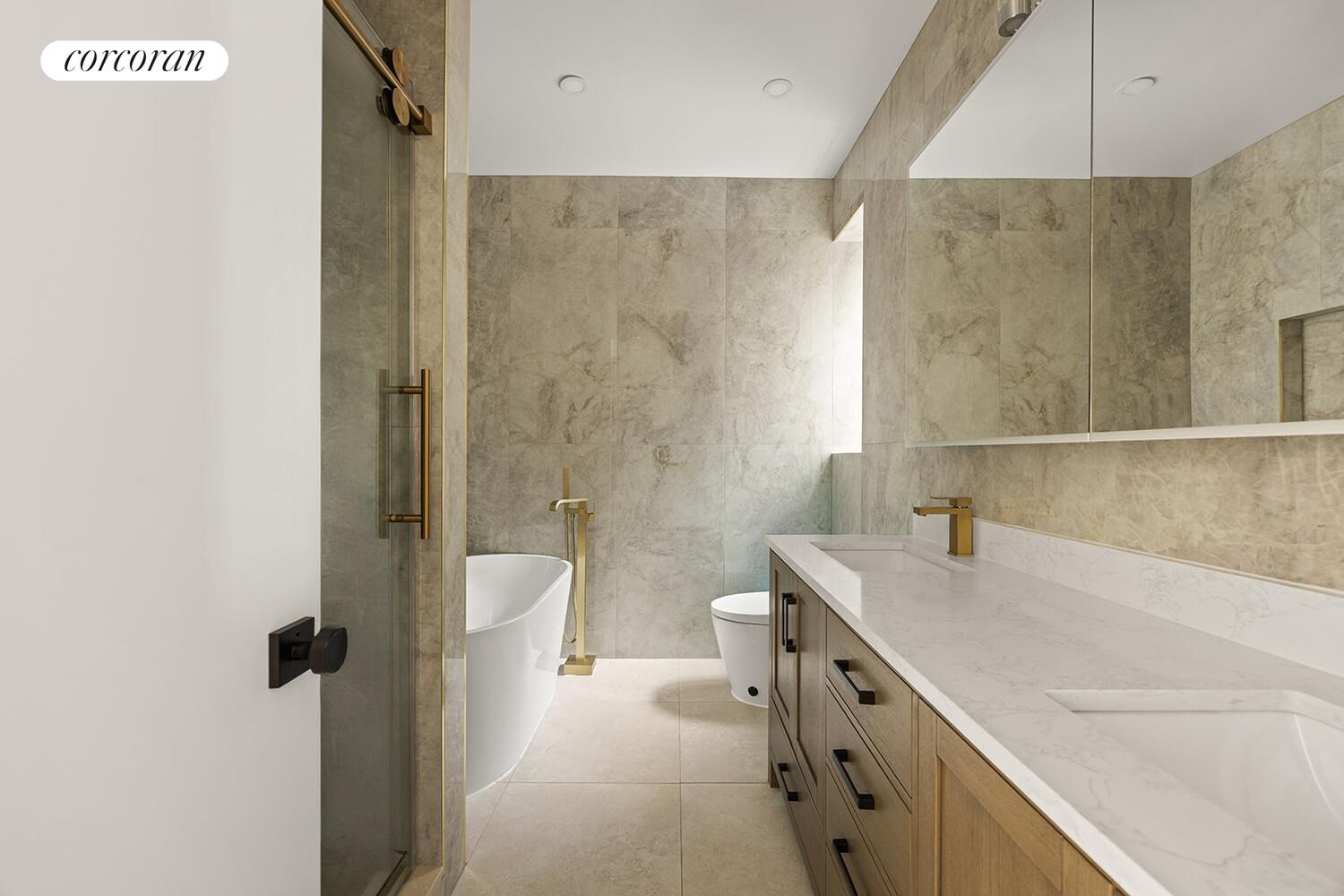 The primary suite offers a custom built-out walk-in closet and a luxurious en suite bathroom finished in Italian marble with gold fixtures, double vanity, separate shower stall, and soaking tub. Two additional bedrooms, one king-sized and one queen-sized, each feature closets and share a beautifully appointed full bath.