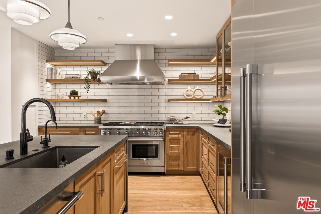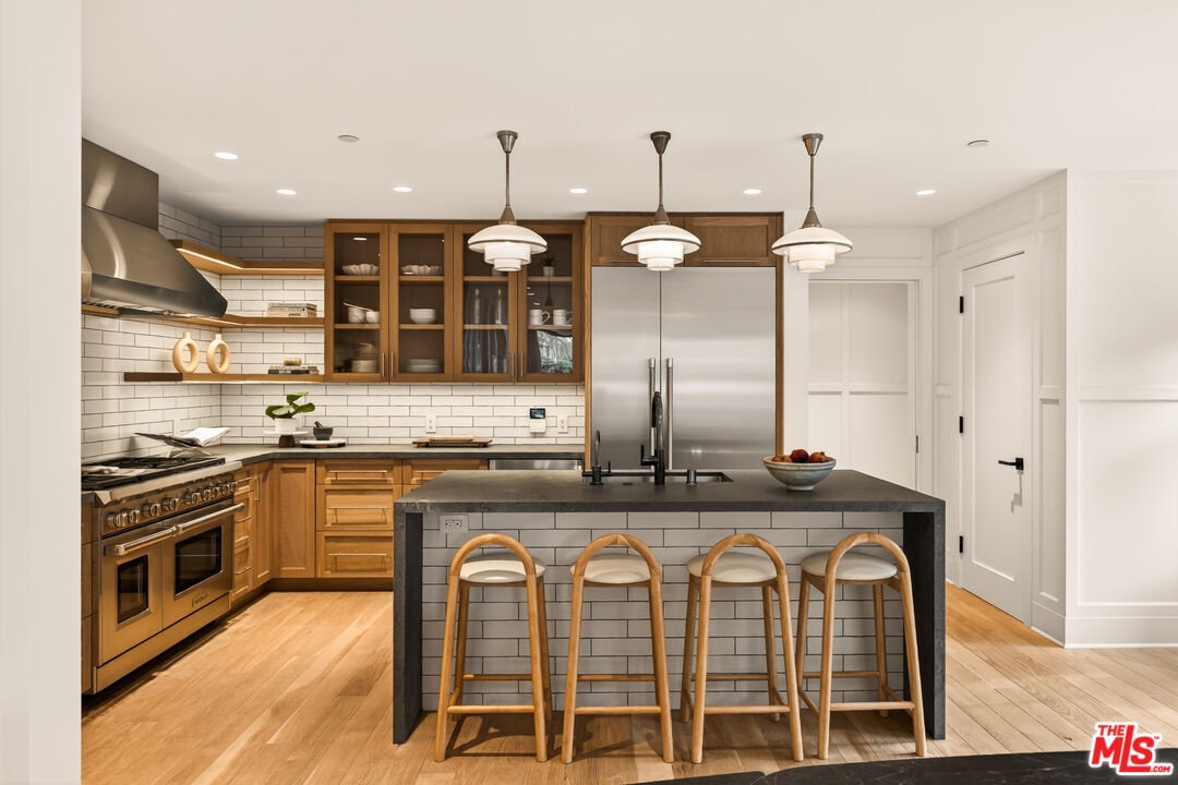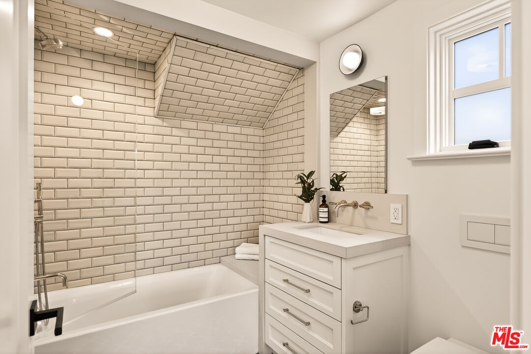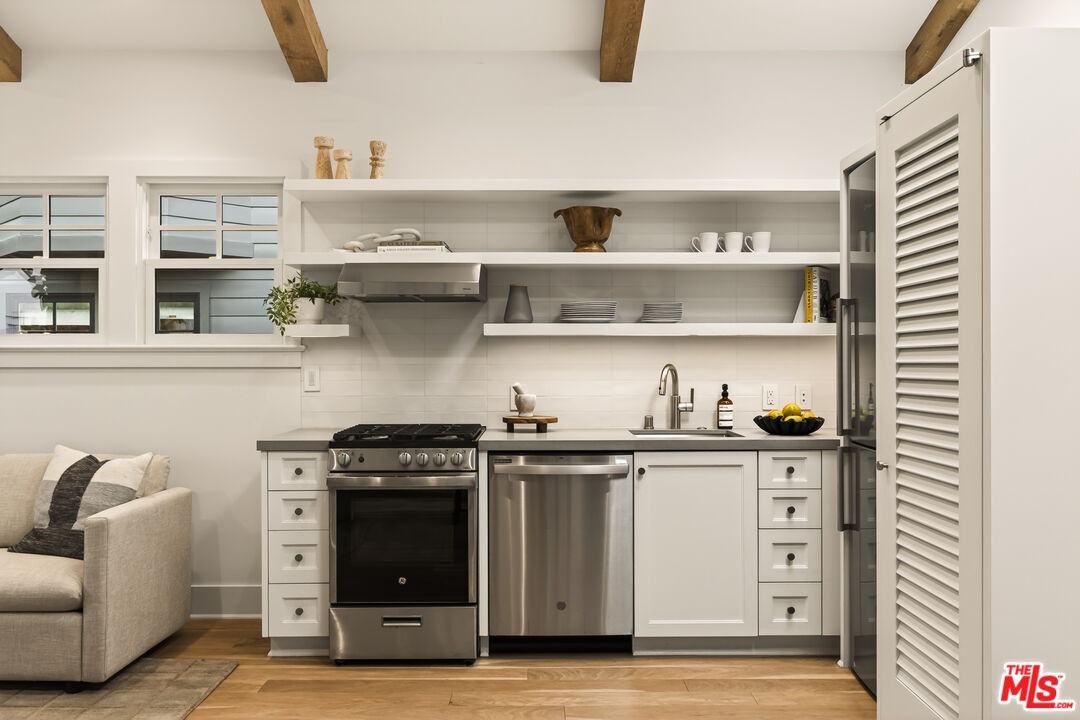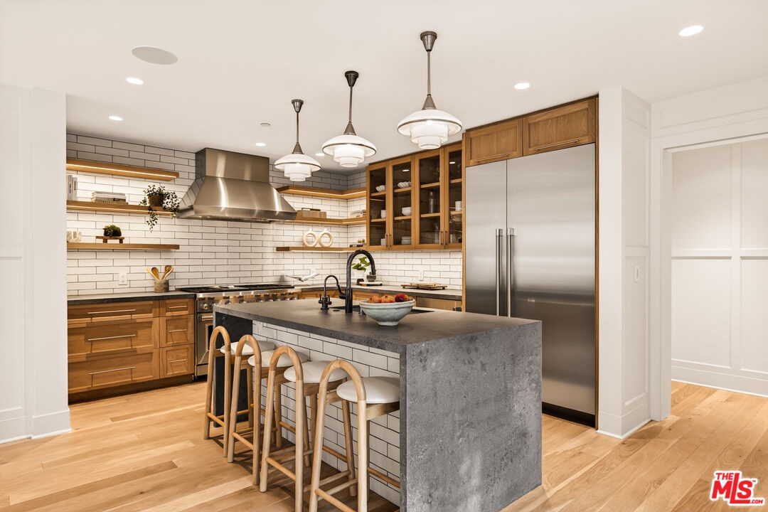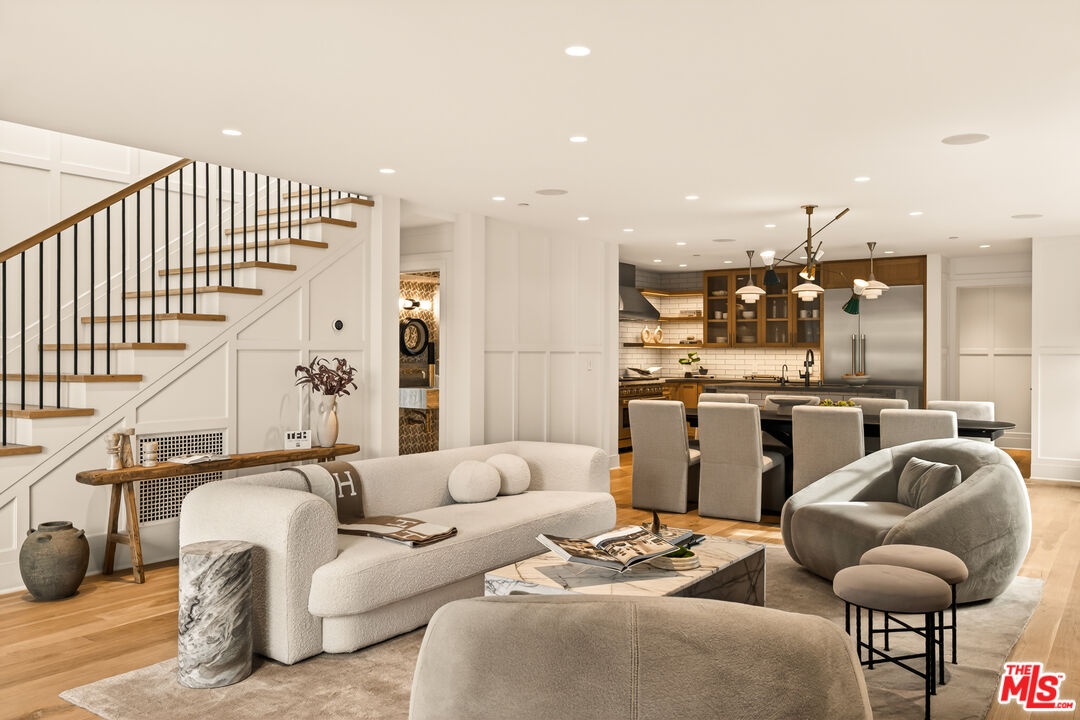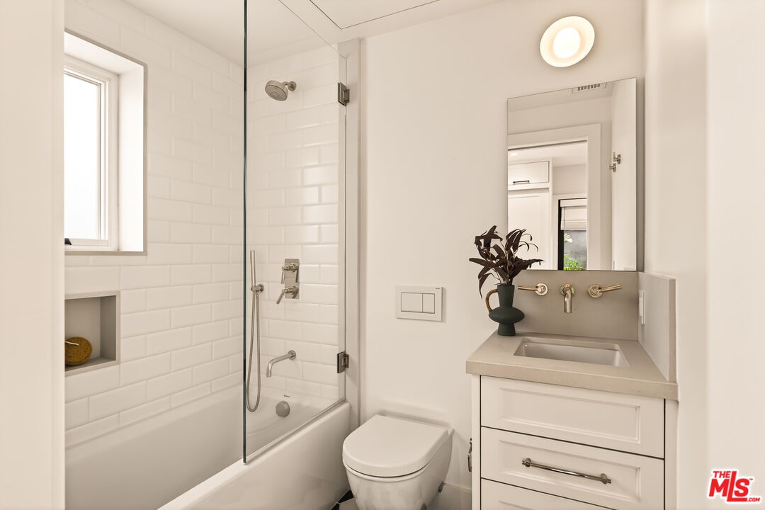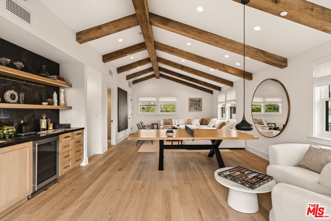 A rare opportunity just steps off Abbot Kinney, this exceptional Venice compound spans a double lot and features an exquisitely appointed main residence w/ a detached guest house/ADU, together creating a warm, soulful, and timeless retreat. Thoughtfully curated by Blinken Interiors, the property offers nearly 3,600 square feet of refined living space with a natural palette and an easy, modern sensibility. Set on one of Venice's most desirable streets and just a short stroll from the ocean, it delivers a rare blend of privacy, style, and effortless California living.Inside, a seamless connection to the outdoors creates an immediate sense of serenity. Handcrafted hardwood floors run throughout the open floor plan, while expansive windows and floor to ceiling sliding pocket doors fill the home with natural light and open to an impressive outdoor deck. Complete with a top of the line Viking grill and fire pit, the outdoor living space is designed for both entertaining and everyday enjoyment. The living room is anchored by a fireplace, creating a warm and inviting place to gather. The gourmet kitchen is both elegant and functional, featuring stone countertops, custom floating shelves and cabinetry, a Wolf range and oven, high end Thermador appliances, Newport Brass fixtures, and striking Otto Mueller Sistrah pendants above the island. Just beyond, the formal dining area is framed by a 1950s Silnovo Italian midcentury chandelier, while a nearby powder room adds a sculptural design moment with a Kelly Wearstler sconce inspired by the California coastline.Upstairs, skylights and Hinkley pendant lighting bring warmth and dimension to the stairwell. The second level includes two well appointed ensuite bedrooms, along with a private primary suite featuring exposed beam ceilings, picturesque windows, a fireplace, two custom walk in closets, and a spa like bath with a soaking tub, separate shower, and large vanity finished with Newport Brass fixtures in Midnight Chrome. The uppermost level offers a flexible lounge, creative space or another bedroom with its own ensuite bathroom, that opens to a large private deck with ocean air, treetop views, and mountain vistas. Whether used as an additional bedroom, office, or retreat, it is a space that easily adapts to the way you live. Completing the property is a beautifully designed detached 1 Bdrm/ 1 Bath guest house/ADU, ideal for extended stays, guests, or home office. With its own open living and kitchen area flowing out to a patio deck and expansive grassy yard, it adds both flexibility and value to this one of a kind offering. Set just a stone's throw from Abbot Kinney, this exceptional location places you at the center of some of Los Angeles' best restaurants, coffee shops, shopping, galleries, and more.