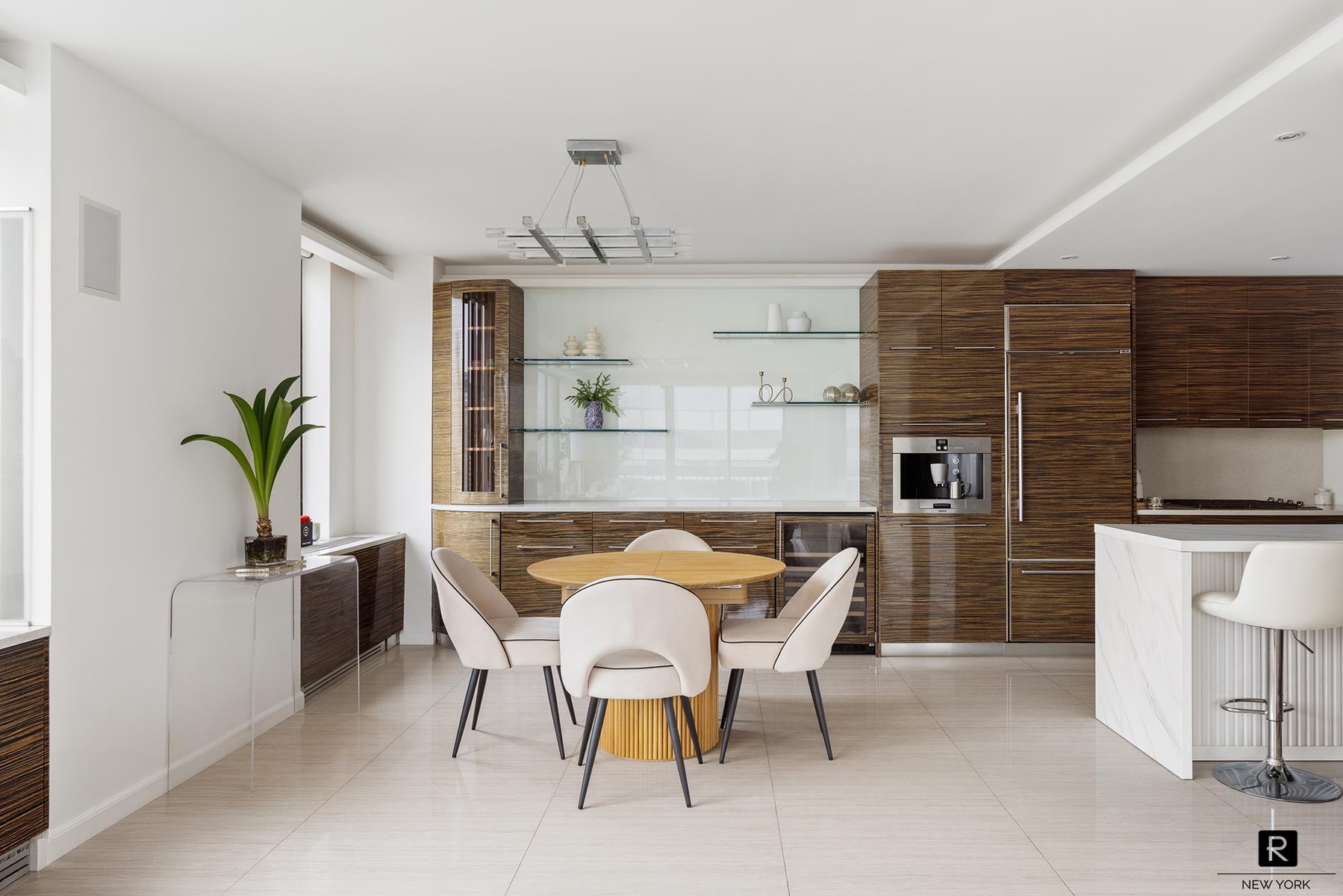 The expansive living room with oversized windows flows naturally into the dining area and kitchen, creating an ideal setting for both everyday living and entertaining. The kitchen by SJB Designs features custom Italian cabinetry in zebrano veneer, extended across the home’s millwork for a cohesive, elevated finish. It is designed with both form and function in mind, equipped with a Wolf range, Sub-Zero refrigerator, wine refrigerator, and built-in Bosch espresso machine.