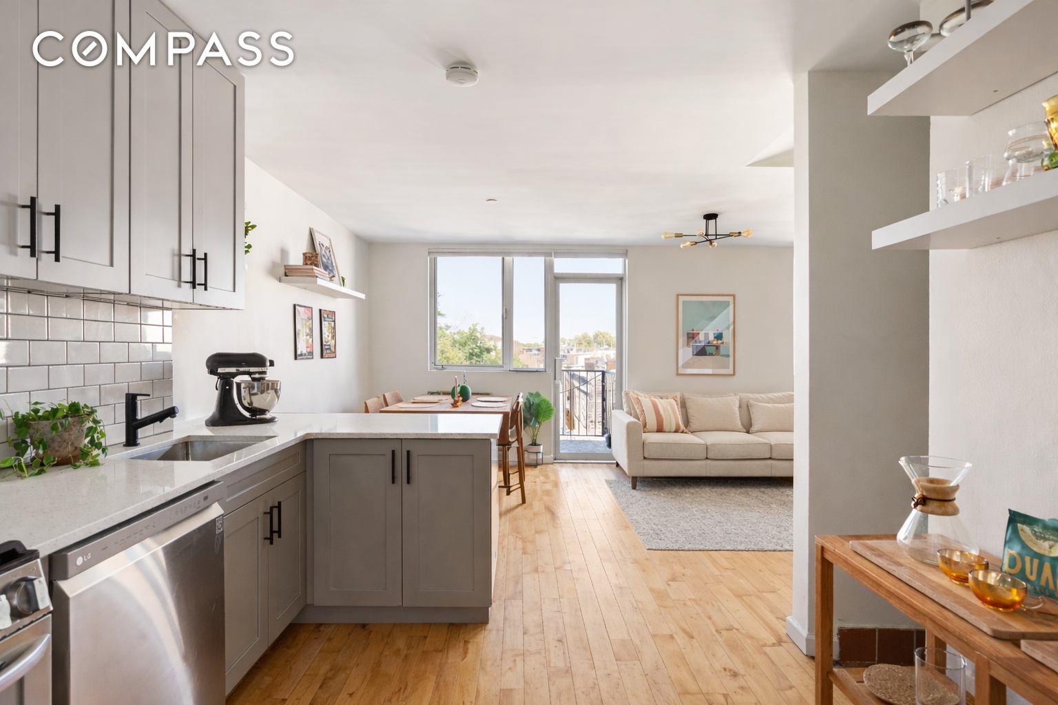 Welcome to 93 Wyckoff Avenue, Unit 4B a sun filled penthouse duplex offering two bedrooms, two and a half bathrooms, and exceptional private outdoor space in the heart of Bushwick.
