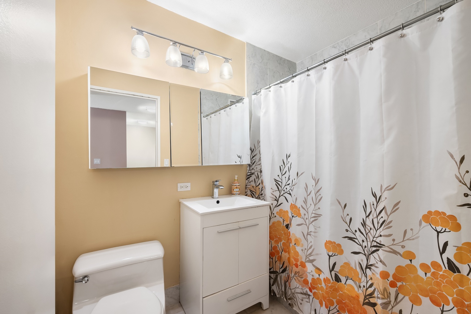 The crisp white kitchen features new quartz counter-tops, deep sink, ample storage and a convenient pass-through to dining area. The oversized bedroom has excellent natural light and more than ample closets. The marble bath has been updated. Hardwood floors throughout.