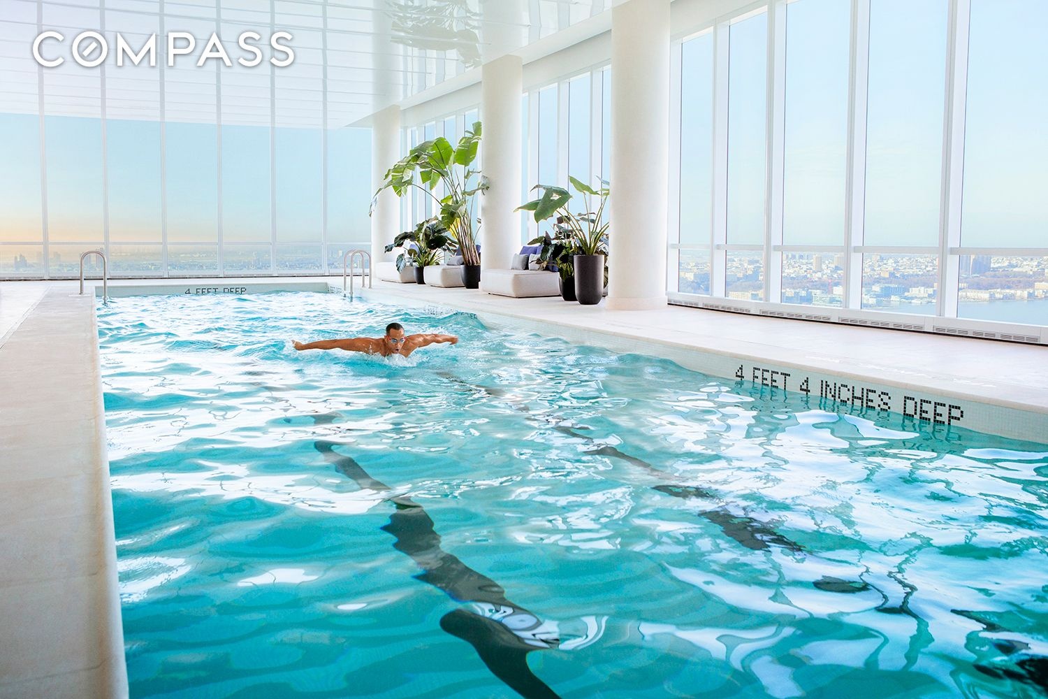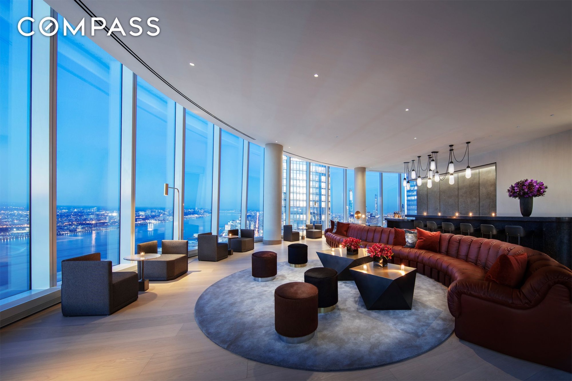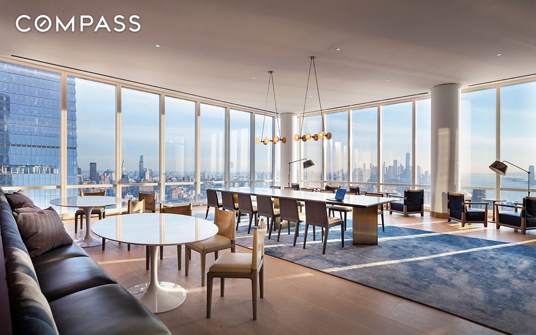 Designed by Diller Scofidio + Renfro in collaboration with Rockwell Group, Fifteen Hudson Yards offers residents over 40,000 square feet of amenities across three floors. Floor 50 is devoted to a full range of fitness and wellness opportunities, including an aquatics center with a 75-foot-long swimming pool, a 3,500-square-foot fitness center designed by The Wright Fit, a private studio for yoga, stretching, and group fitness classes, a spa with treatment rooms, and a beauty bar for hair and makeup services. Floor 51 features two corner private dining suites with wine storage and tasting rooms, a lounge with breathtaking Hudson River views, a club room with billiards tables, card tables, and large-screen TV, a screening room, business center, golf club lounge, and an atelier with communal working table and lounge seating.