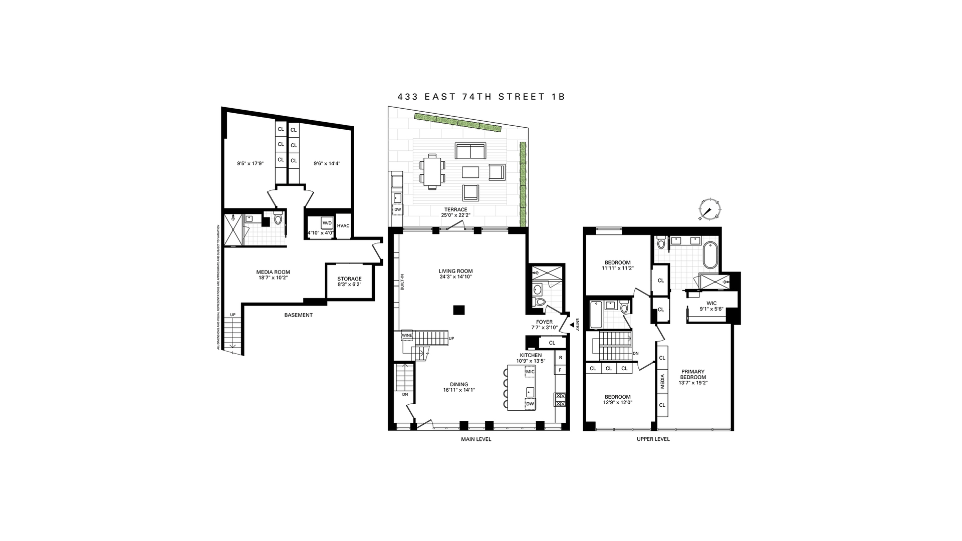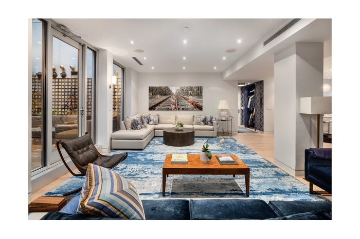Additional residence features include an in-unit washer and dryer, central air conditioning, a built-in sound system, recessed lighting, hardwood floors throughout, and automated window treatments and shades.