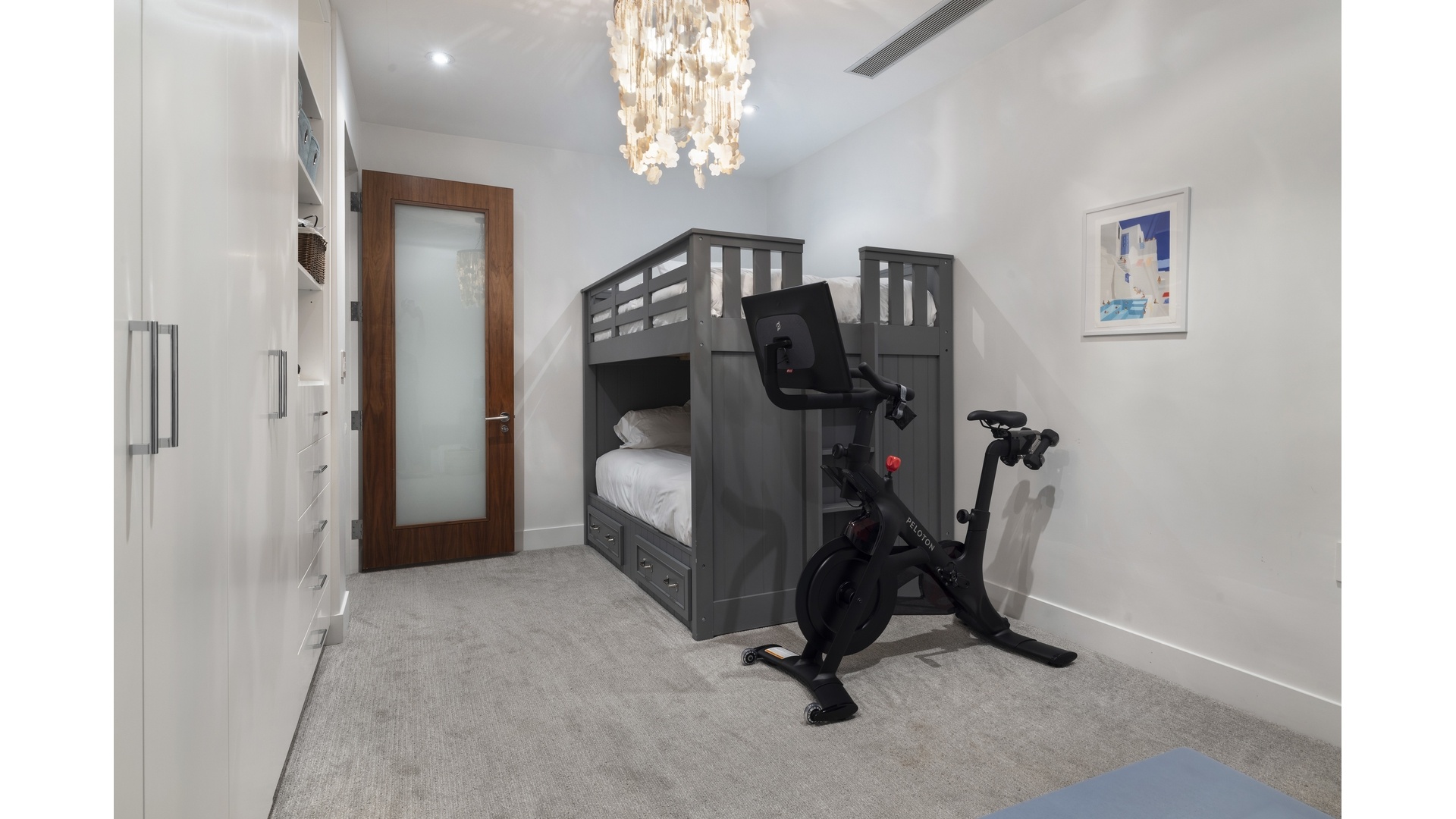 Two additional bedrooms are also located on this level, including a south-facing room with floor-to-ceiling windows. These bedrooms share a beautifully appointed full bathroom featuring mosaic tiles and a deep soaking tub.