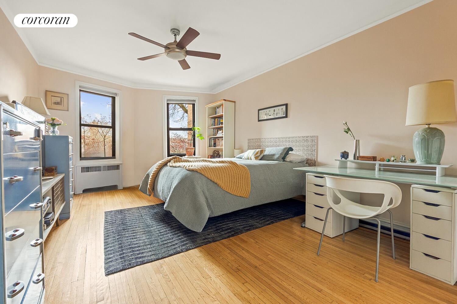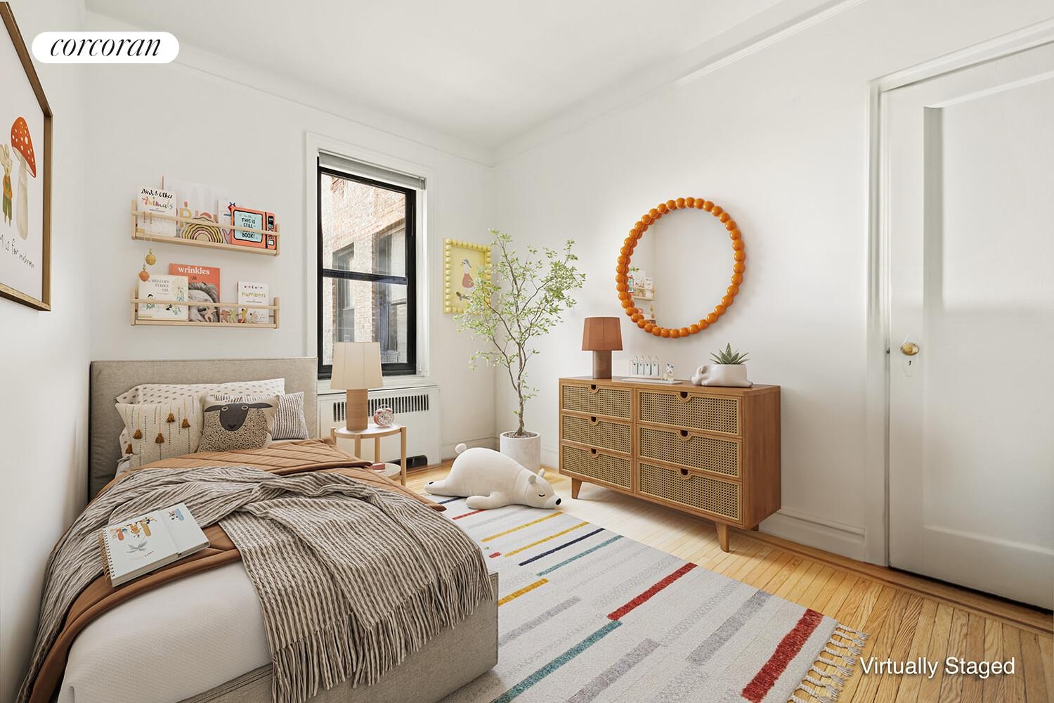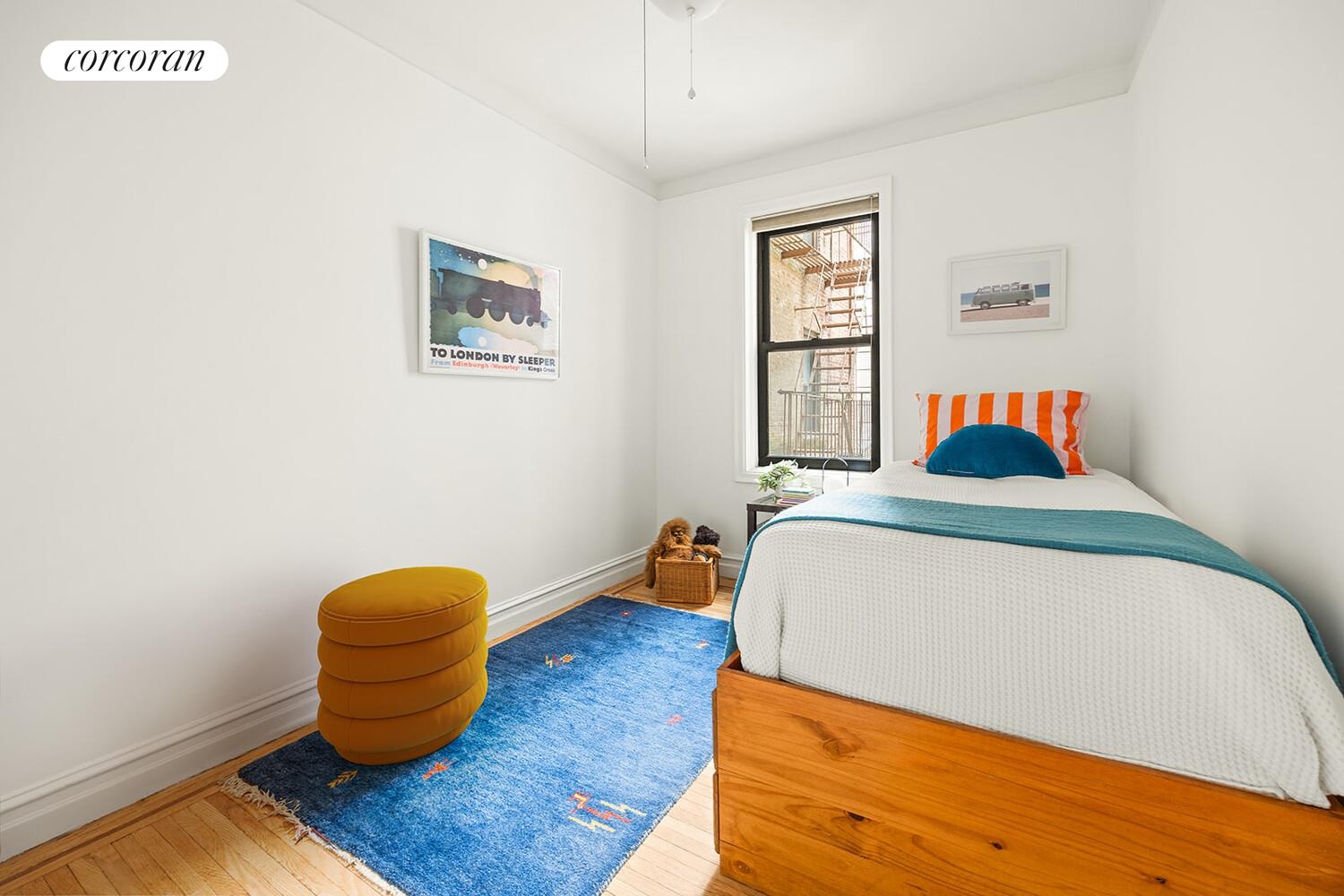 Currently configured as a 3-bedroom, the primary bedroom comfortably fits a King sized bed, two dressers and can accommodate a separate seating area. The two additional bedrooms are similar in size, each with a large window facing the quiet backyard and ideal for guests, children, or a home office. A separate hallway near the bedrooms offers two additional closets, making storage truly plentiful throughout. The lightfilled renovated windowed bathroom is at the end of the hallway.