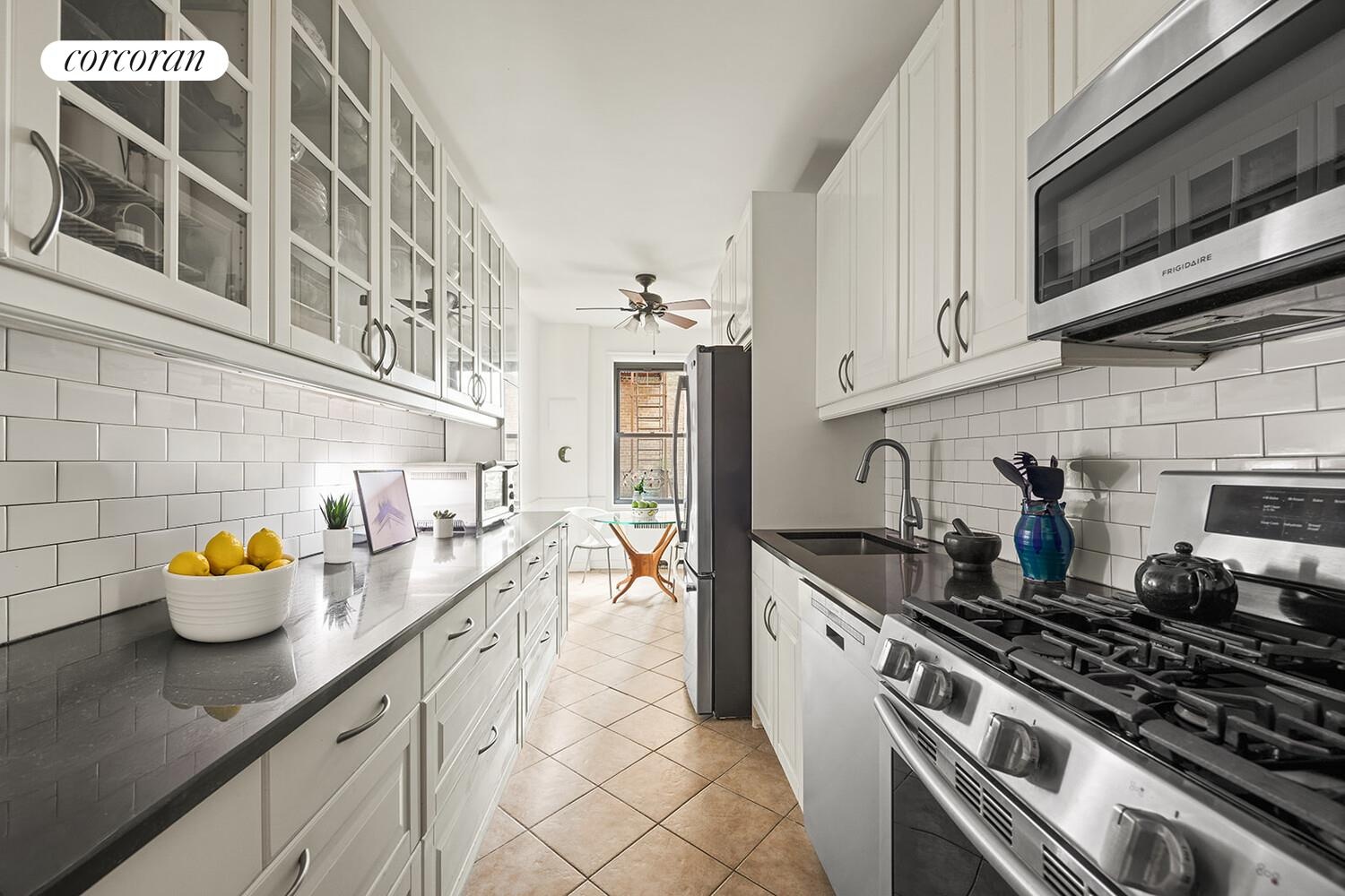 The renovated windowed eat-in kitchen is outfitted with white Shaker-style cabinetry featuring upper glass door cabinets, sleek quartz countertops, and stainless-steel appliances. The kitchen is a warm and inviting space with generous storage and counter space throughout.