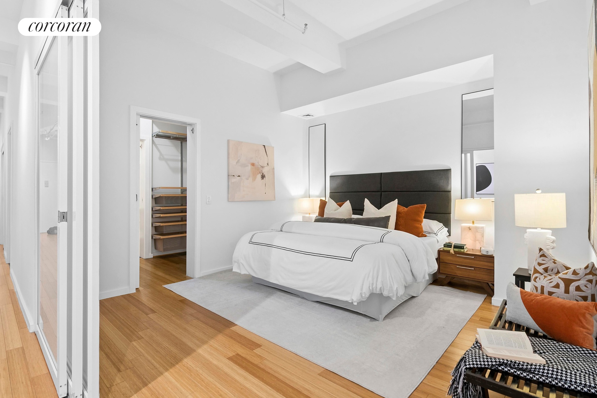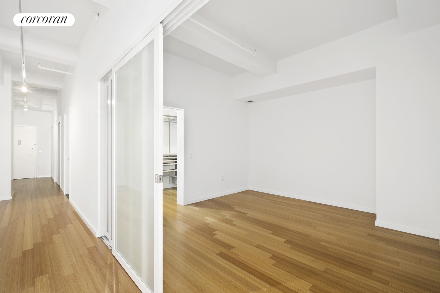 The primary sleeping area is set apart by a sleek sliding glass wall, while two additional interior rooms offer exceptional flexibility-perfect for bedrooms, a home office, or creative use. Storage is abundant, highlighted by a custom-finished walk-in closet. The spacious bathroom features dual sinks and a deep soaking tub, and an in-unit washer/dryer completes the home.
