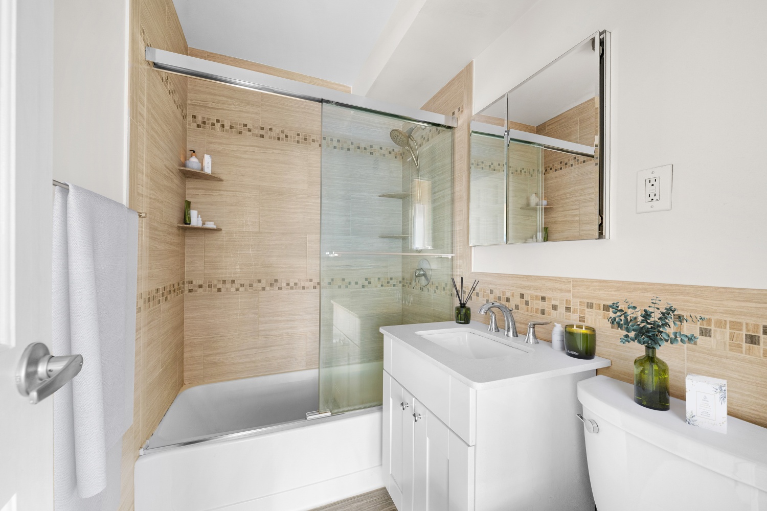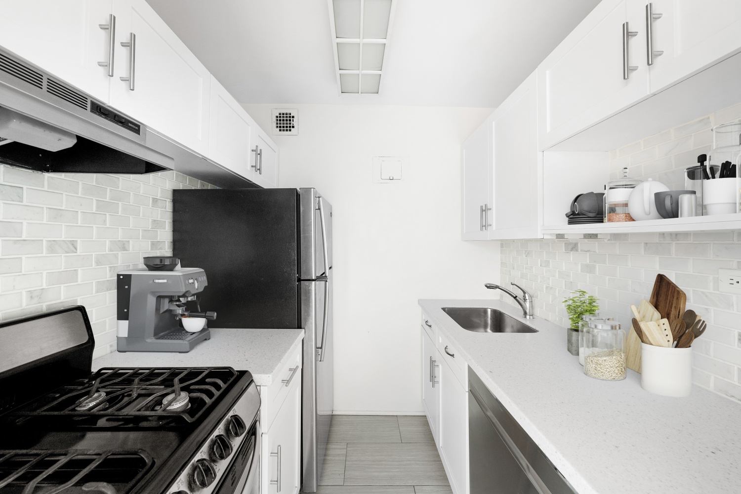 The renovated galley kitchen is both stylish and functional, featuring stainless steel appliances (including a full-size dishwasher), a beautiful tile backsplash, and abundant cabinetry.