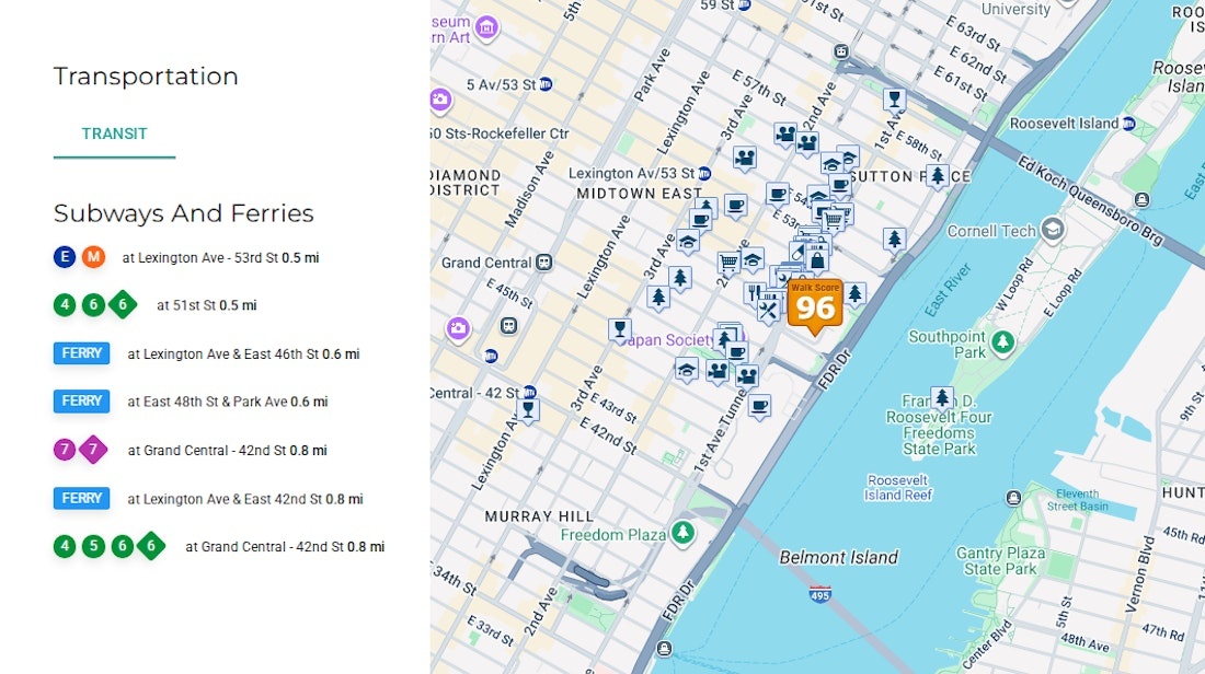 2 Beekman Place is just two blocks from Peter Detmold Park, which features a dog run and river paths for easy strolls, as well as Dag Hammarskjold Plaza, Sutton Place Park, and multiple other lovely green spaces! Transportation is a breeze with the 6 train at 51st and Lex, the E/M trains at 53rd and 3rd, the M50 crosstown bus on 50th, and the Ferry on East 46th and Lex. 2 Beekman Place has a Walk Score of 96 out of 100, making it a Walker's Paradise.