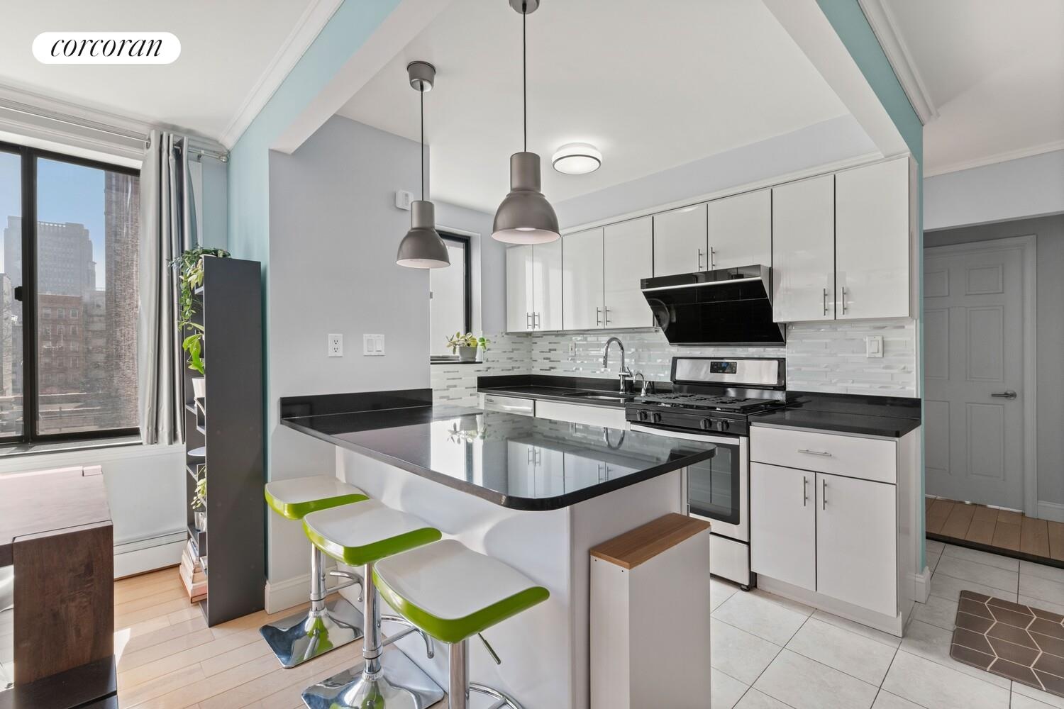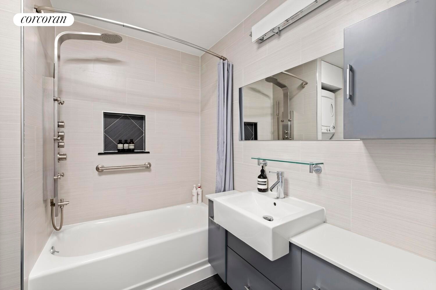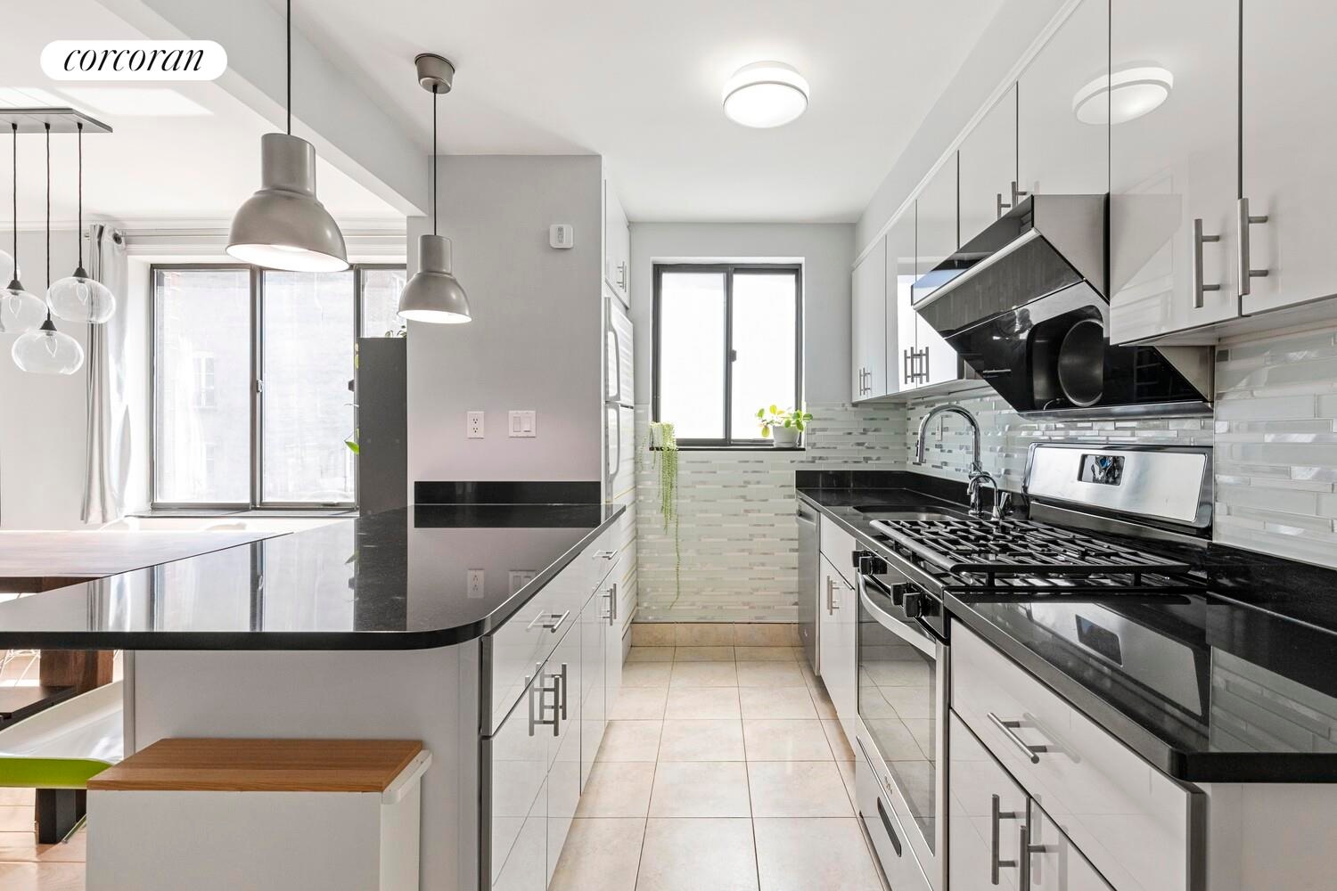 The windowed, open kitchen was thoughtfully renovated with an oversized breakfast nook, full-sized appliances, including a dishwasher, a sleek range hood, granite countertops, glass mosaic backsplash, and a newly updated faucet. The bathroom is finished with porcelain tile flooring and walls, complemented by a vanity with a quartz-style countertop and ample storage below. Additional details include a brushed stainless steel shower system, an oversized tub and toilet, and contemporary chrome finishes throughout. For added convenience, the home includes an in-unit washer and dryer.