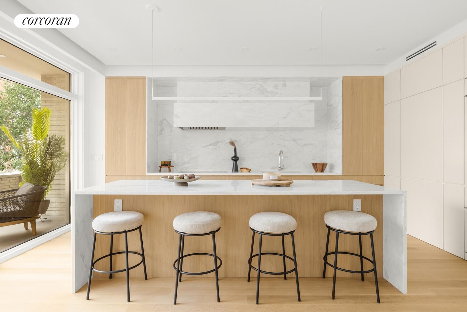 The elevator opens directly into a gracious foyer, setting the tone for a thoughtfully laid-out residence with three bedrooms, three-and-a-half bathrooms, a windowed library, and a spectacular great room perfect for entertaining.