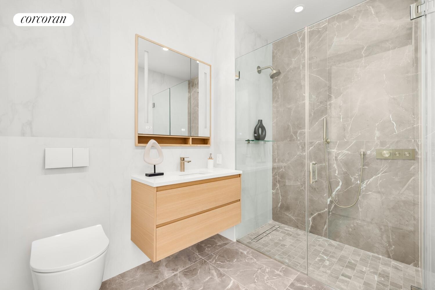 The primary suite is calm and well-proportioned, featuring a south-facing balcony, a walk-in dressing room, and an elegant bathroom with radiant heated floors, a walk-in shower, and a custom vanity with Robern medicine cabinets. Secondary bedrooms are functional and bright, each offering generous closet space and access to their own full bathrooms.