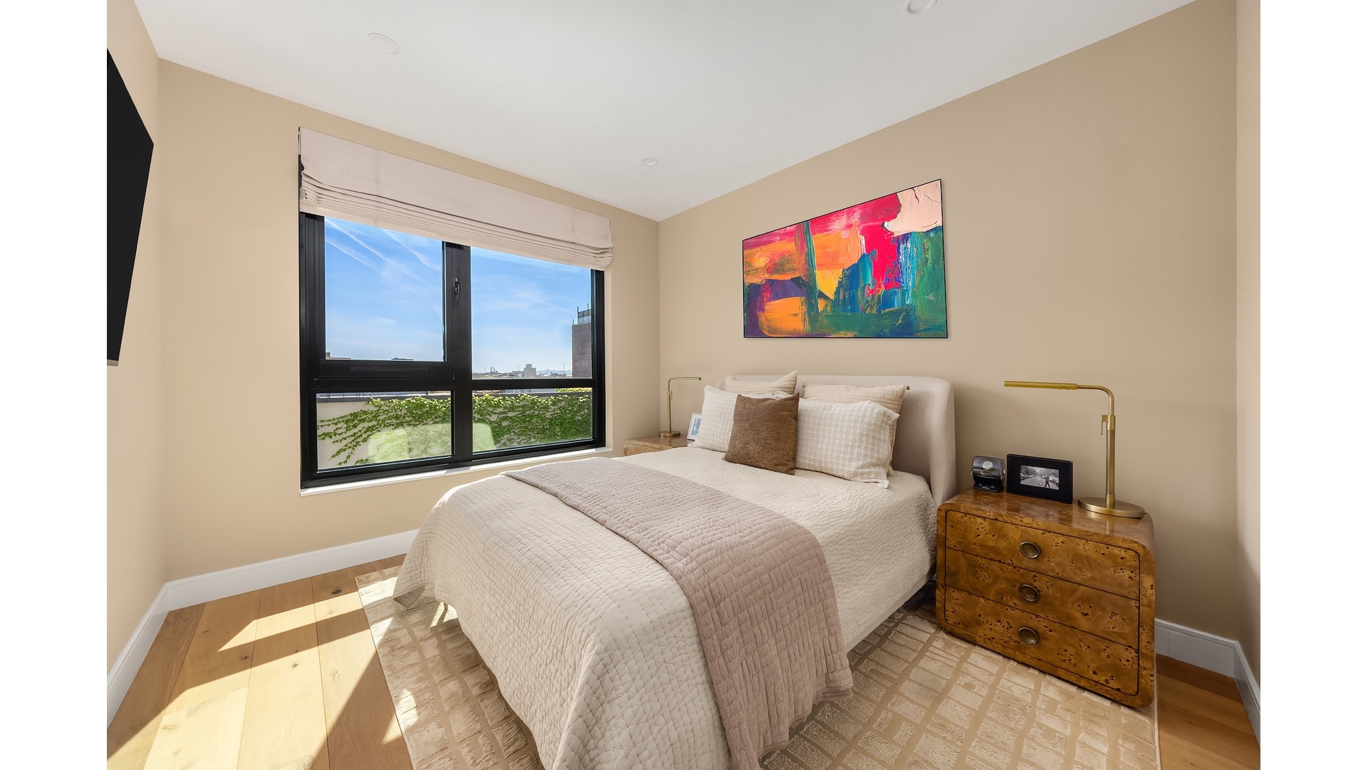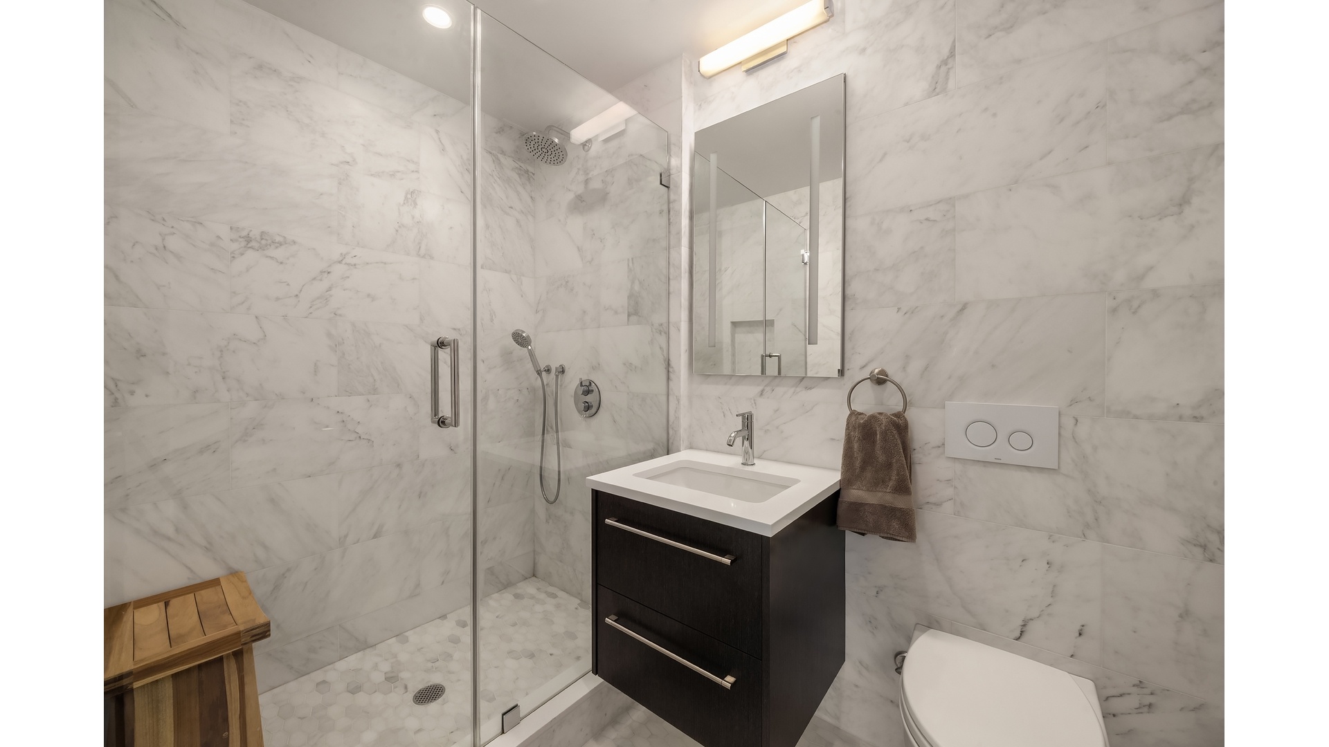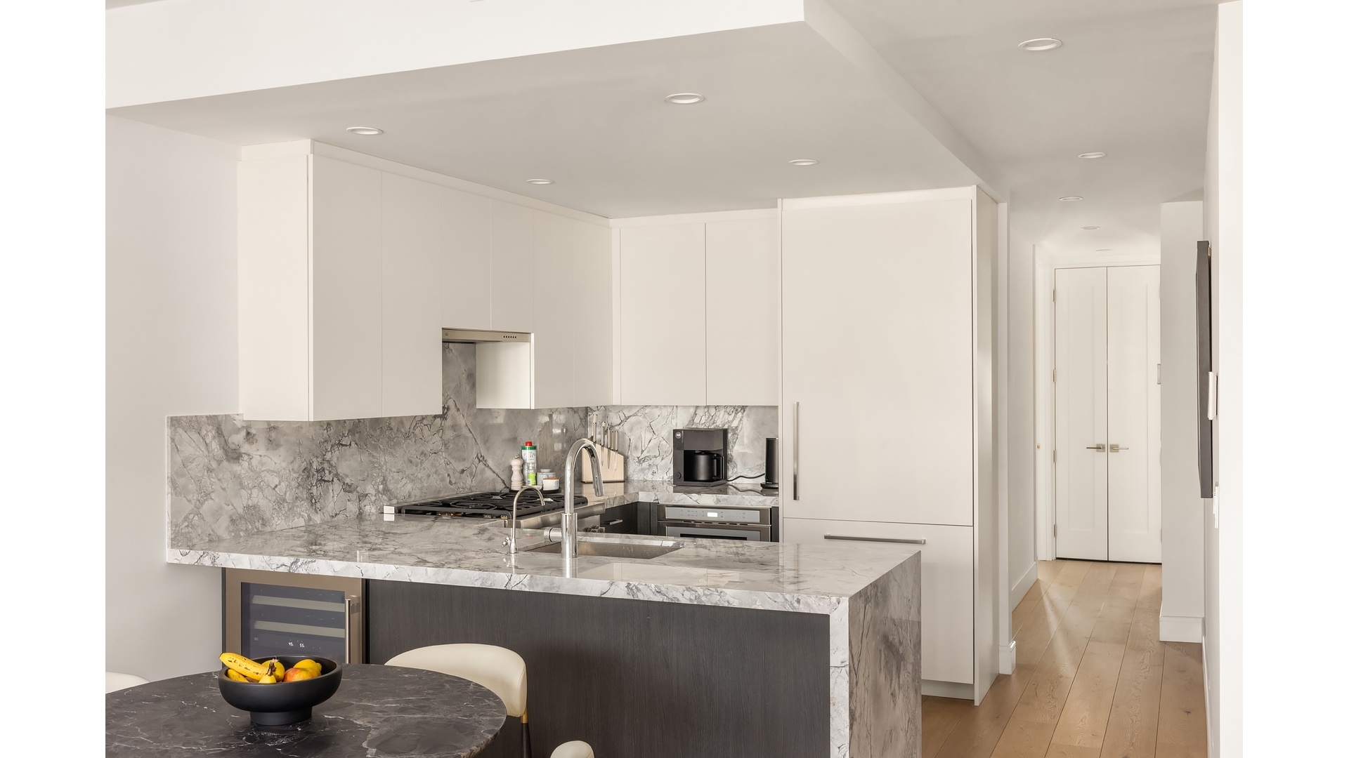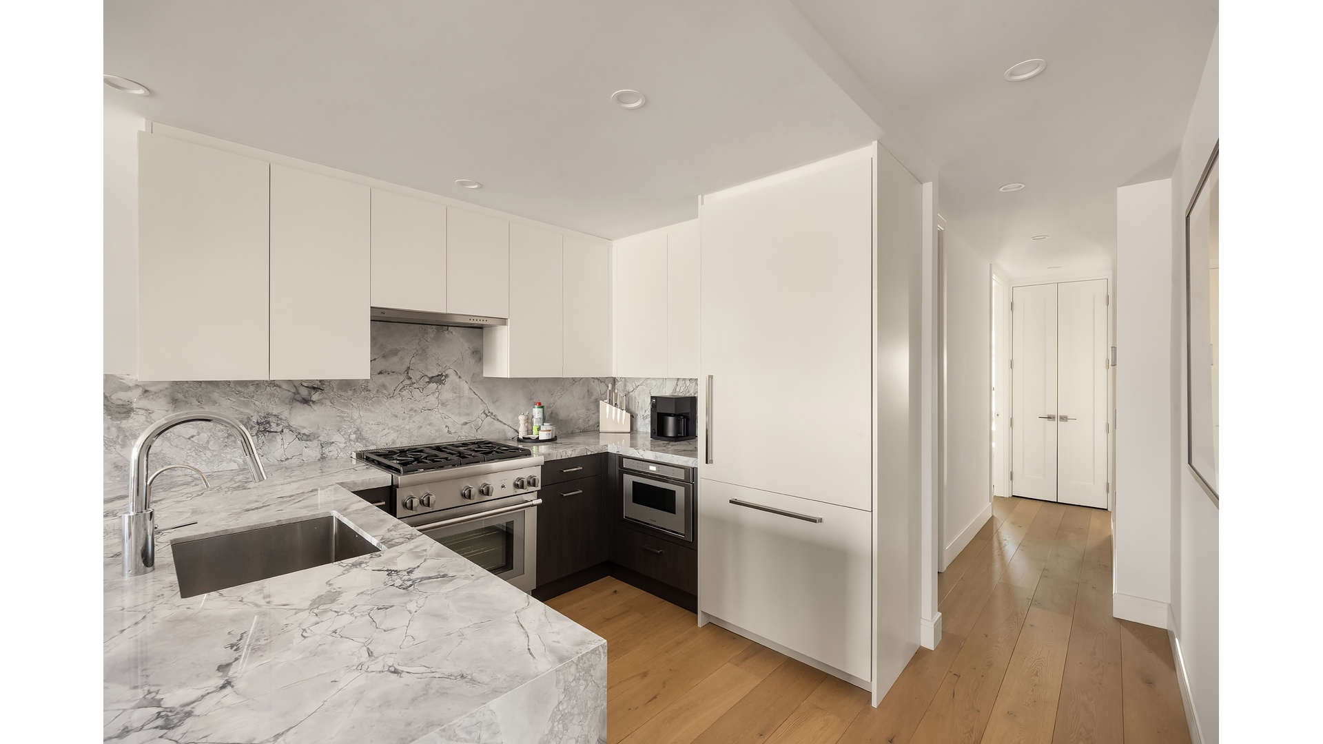 Residence 4B is a large floor through home offering three spacious bedrooms (one of which is currently being used as an exquisite dressing room with built in closets,) two bathrooms, and a terrace which offers unobstructed views of lower Manhattan and downtown Brooklyn. The open chef's kitchen offers top of the line Thermador appliances, custom Downsview cabinetry and timeless Italian marble countertops. The primary bath offers the perfect sanctuary with statuary marble finishes, Toto fixtures and custom Robern medicine cabinets. The secondary bathroom features a deep soaking tub from Porcelanosa, custom marble tile and storage.