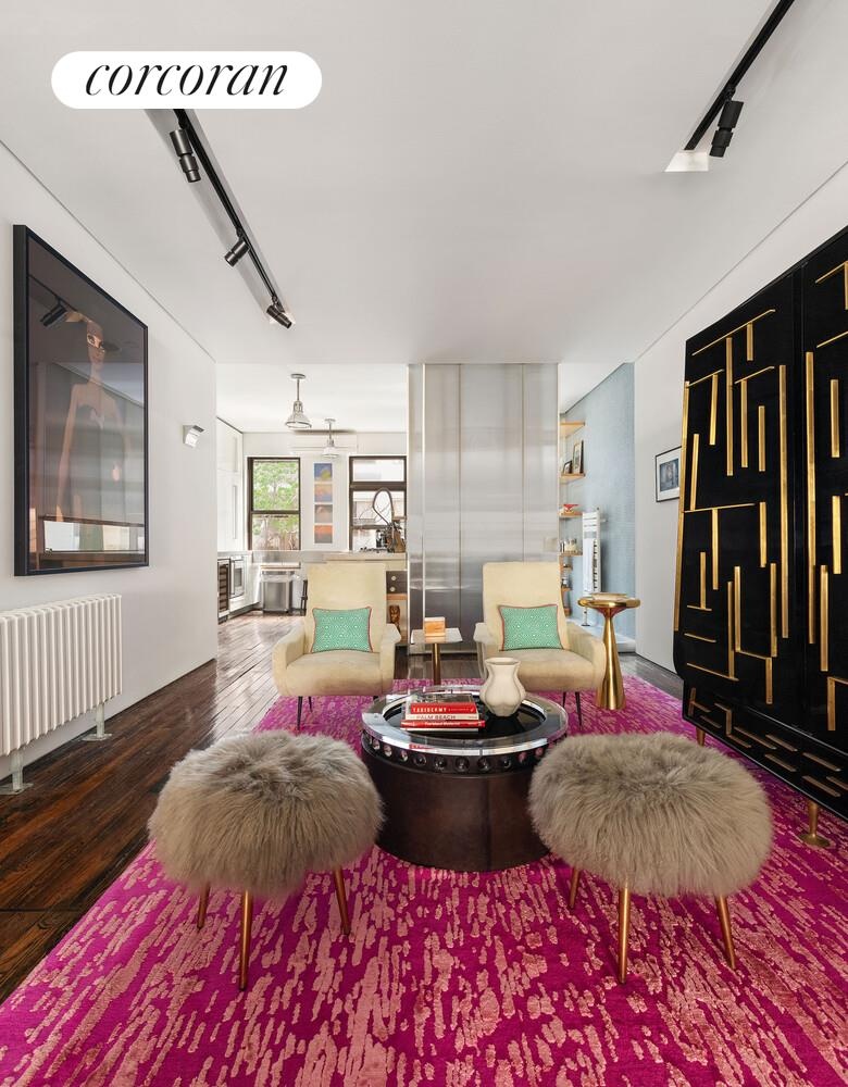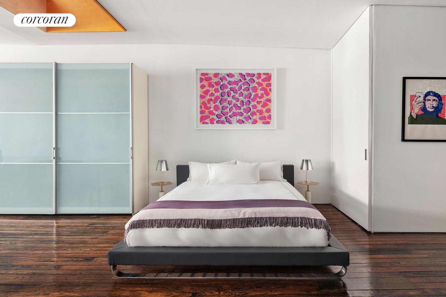 Additional features include split-system heating and cooling, steam radiators, a high-end home automation system controlling electric window shades and designer lighting throughout, and a Bang & Olufsen sound system. The home's proportions allow for a variety of uses, with ample space to accommodate a dedicated home office or additional sleeping area. A rarely used shared roof terrace sits directly above the loft, offering convenient outdoor space for a select number of residents.