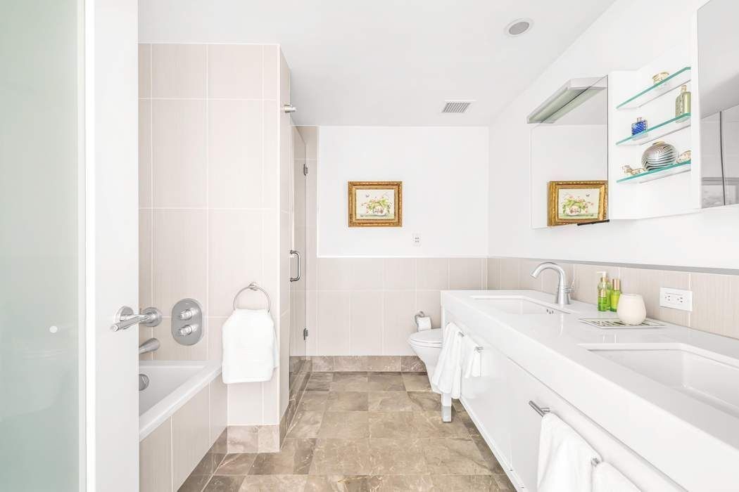 The corner primary suite is pin-drop quiet, sharing no wall with a neighboring unit, and takes in open sky and architecture through unobstructed windows. It accommodates a king bed, desk, and seating with ease, and opens to a five-piece spa bath with stone finishes, dual vanities, a Zuma soaking tub, and glass-enclosed shower. The second bedroom is equally quiet and well-finished, with its own pristine tiled bath. A full-size washer/dryer sits conveniently in the hall between both rooms.
