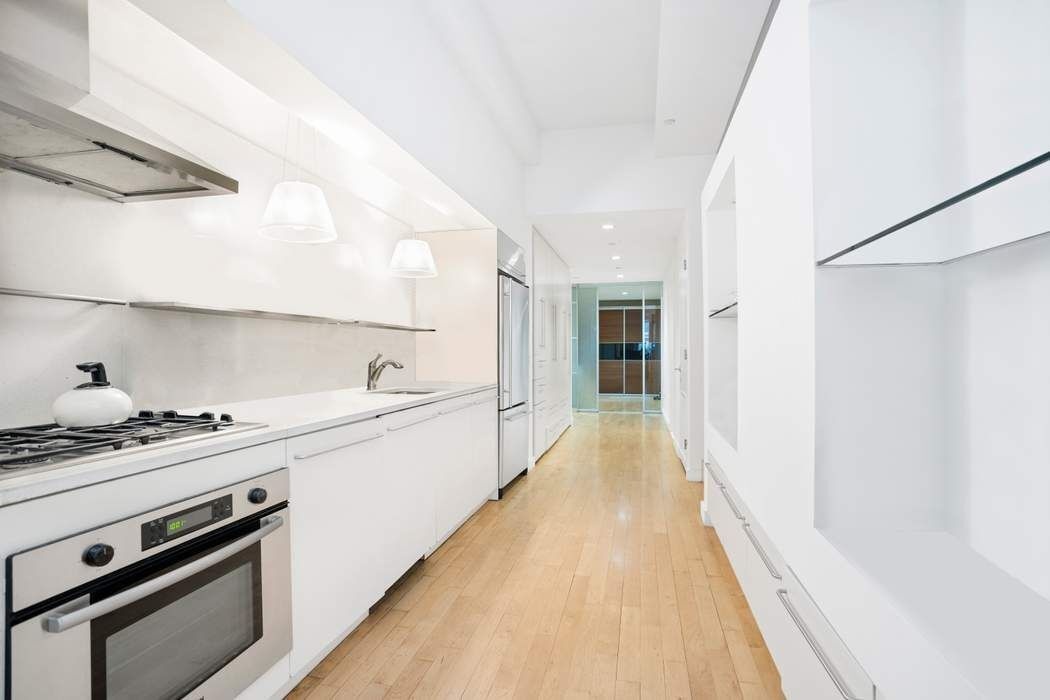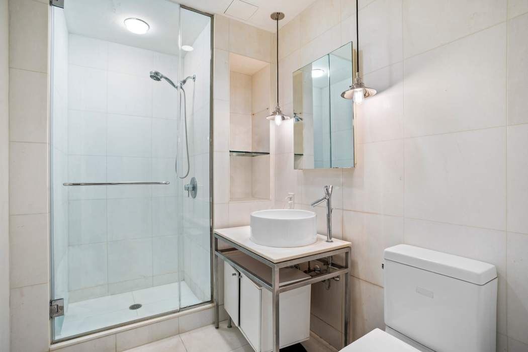 The sleek, minimalist bathroom is appointed with elegant Starck-designed finishes, while additional features include rich hardwood floors, soaring ceilings, custom storage solutions, distinctive architectural details, and the convenience of an in-unit washer and dryer.