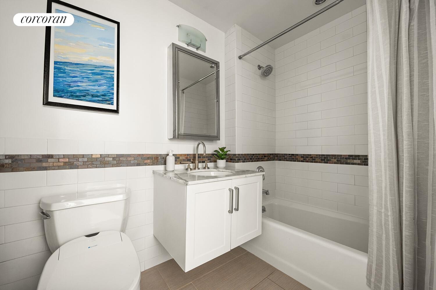 Oversized southwest-facing windows bring beautiful natural light into the entire apartment throughout the day, creating a bright and inviting setting for both daily life and entertaining. The open kitchen is thoughtfully designed with an oversized breakfast bar, granite countertops, a glass tile backsplash, and generous cabinet storage, all flowing easily into the living and dining area. A private balcony with views of the Statue of Liberty adds a welcome outdoor extension to the home.