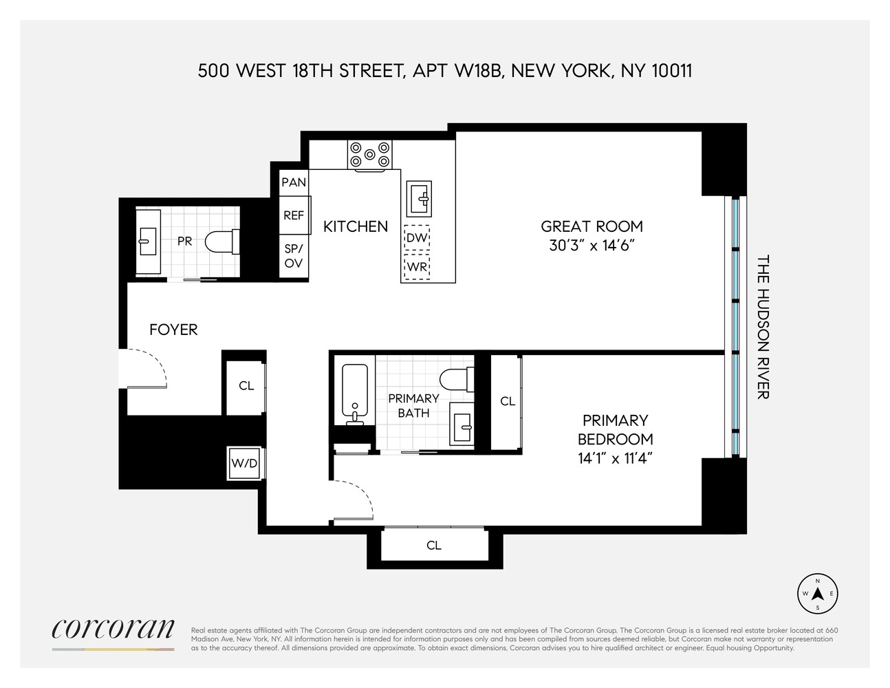 West 18B at One High Line is a beautifully proportioned one-bedroom, one-and-a-half-bathroom residence offering 1,042 square feet of refined living space. The residence opens into an elegant entry foyer that flows into an expansive great room framed by floor-to-ceiling windows, filling the home with natural light and showcasing stunning river and sunset vistas. The open kitchen is thoughtfully designed with custom Grey Larch cabinetry by Bulthaup, White Princess Quartzite countertops, a refined Gabellini Sheppard backsplash, a full suite of Gaggenau appliances, and stainless-steel fixtures by CEA Design.