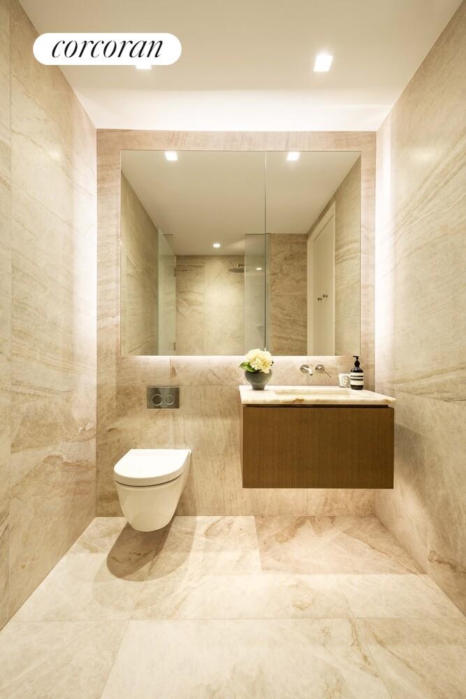 Additional features include a powder room finished in vein-cut Grigio Onyx, generous closet and storage space, a premium stacked washer and dryer, limewashed walls throughout,, and a state-of-the-art home automation system by Kraus Hi-Tech, including custom automated blinds,.