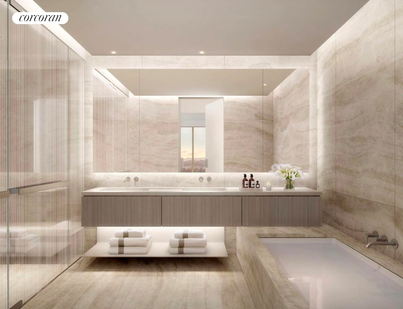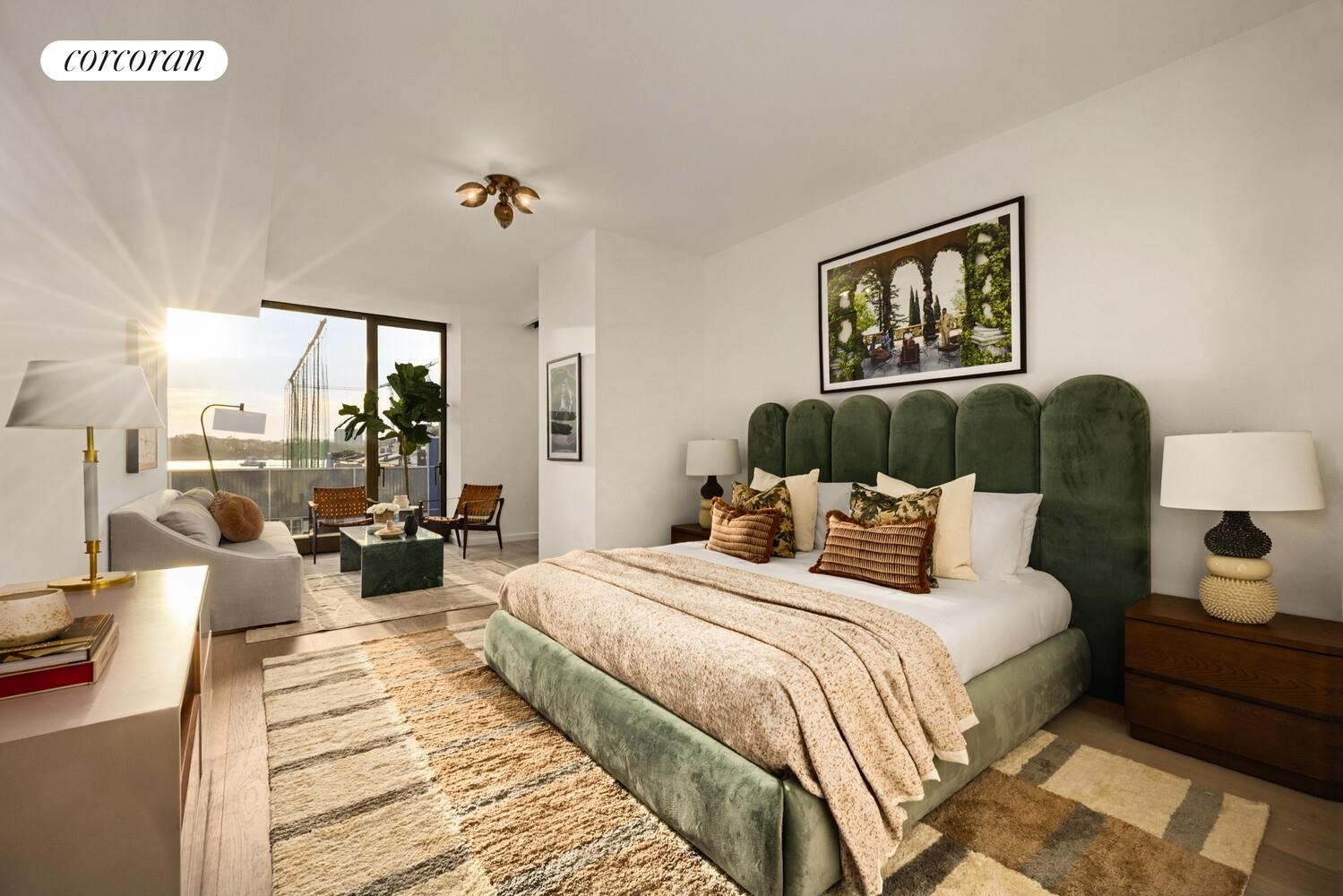 This luxurious, comfortable primary bedroom features two ample and accessible closet spaces, floor-to-ceiling windows, and an en-suite bath featuring a relaxing, soaking tub and a radiant heat floor. The second bedroom, with views of the Hudson, also features its own en-suite bathroom.