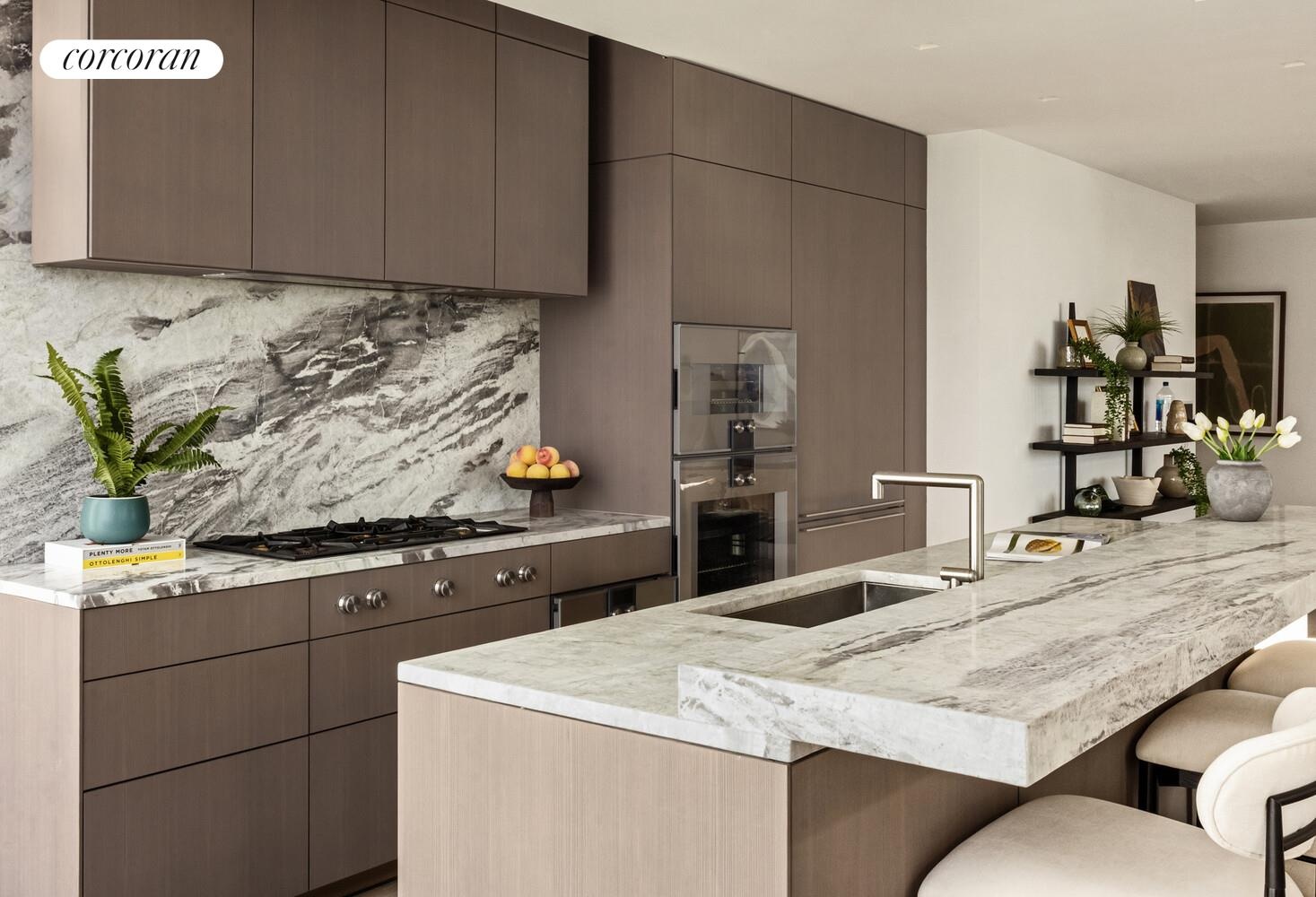 The state-of-the-art open kitchen, designed by Bulthaup, features a suite of Gaggenau appliances to help you entertain and enjoy.