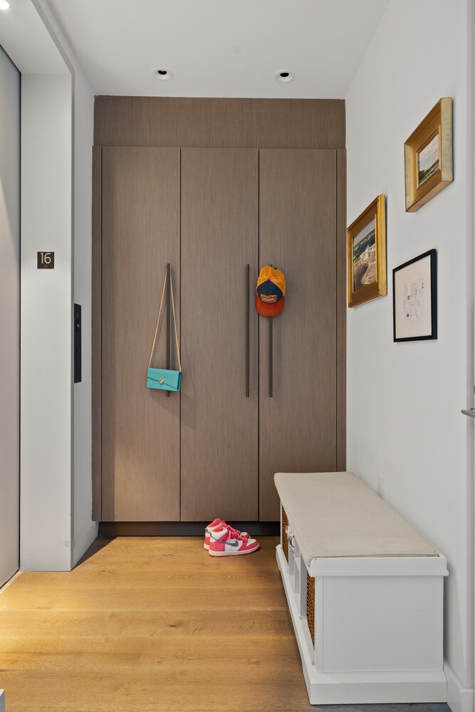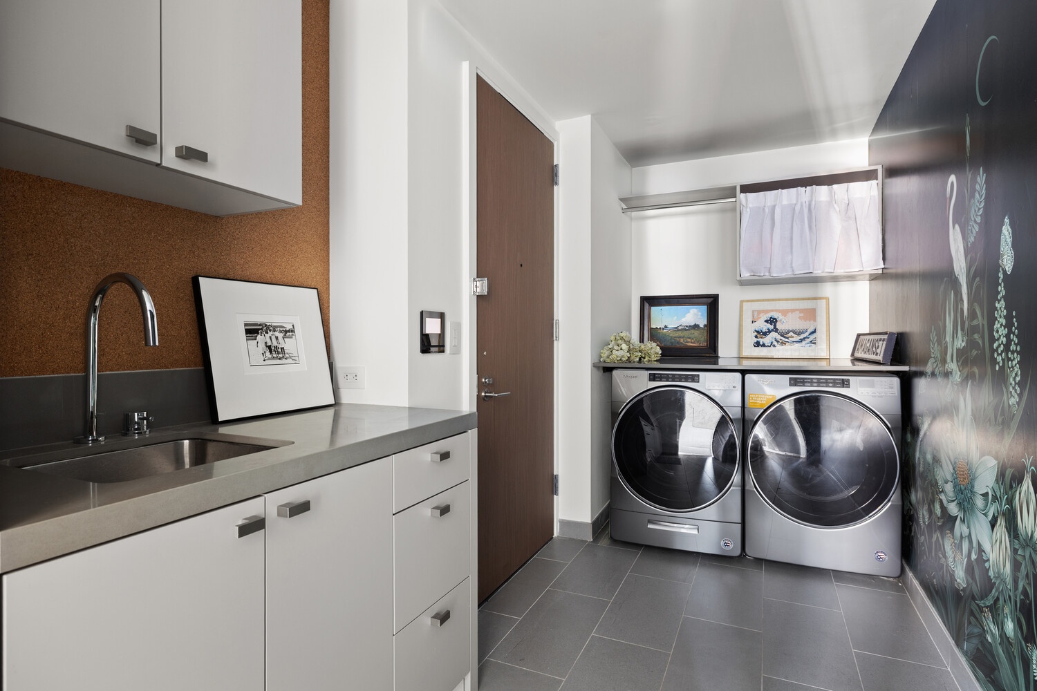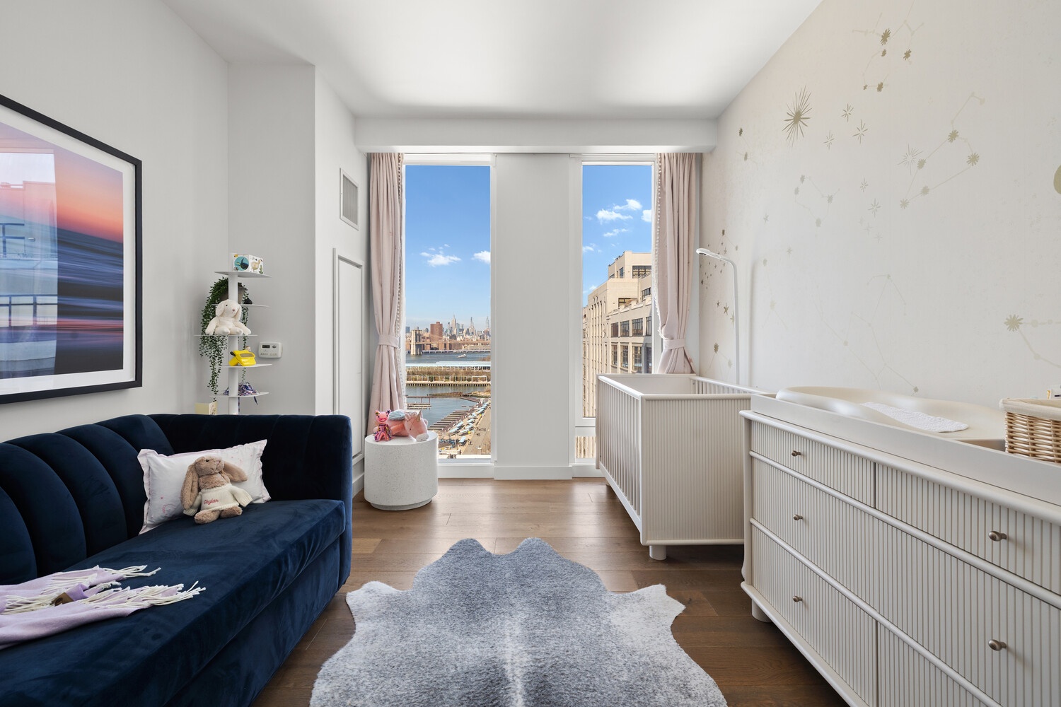 Residence 16B at Quay Tower offers exceptional waterfront living in one of Brooklyn's premier full-service buildings. Spanning approximately 2,057 square feet, this three-bedroom, two-and-a-half-bath home delivers scale, natural light, and a layout that truly works. A high-speed elevator opens directly into the residence, creating a seamless sense of arrival, while a secondary entry through a fully built-out mudroom-with custom Italian cabinetry, utility sink, and vented washer/dryer-handles everyday living without compromising the main space.