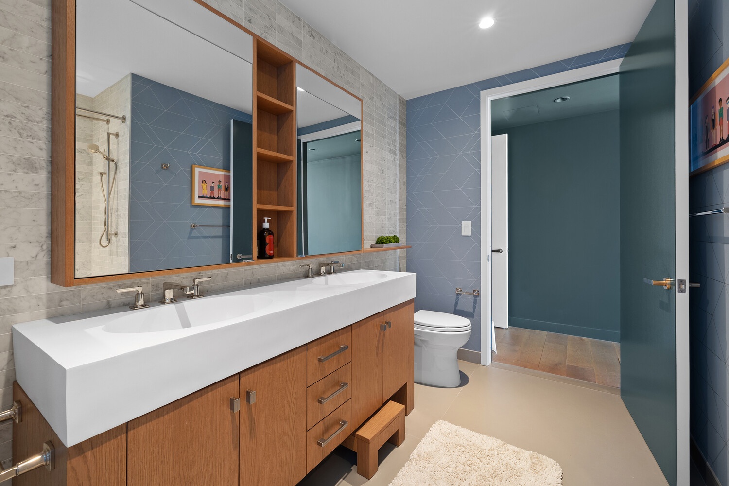 The kitchen is designed to perform without overcomplicating it: a large center island, white oak cabinetry, and leathered White Princess quartzite surfaces anchor the space. A fully integrated Gaggenau appliance suite, smoked bronze hardware, and built-in wine refrigeration complete a setup that is both polished and practical. A marble powder room sits just off the main living space, ideal for entertaining.