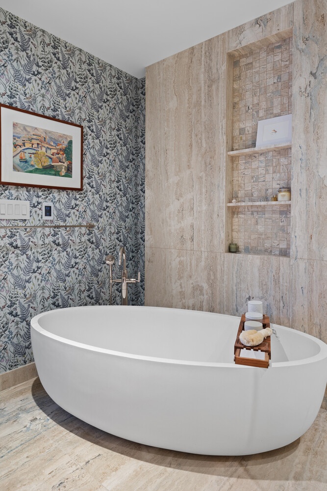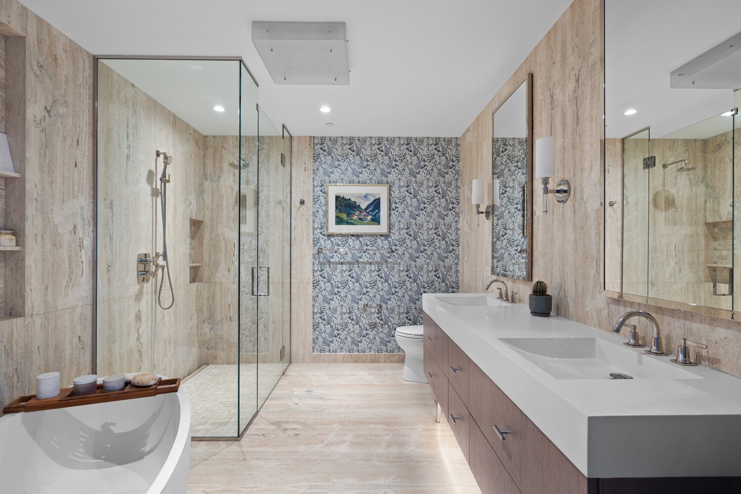 The primary suite is positioned for privacy and scale, featuring a dedicated dressing area, three fully built-out closets, and a spa-quality bath finished in Alabastrio Rustico travertine slabs. Radiant heated floors, a freestanding soaking tub, and custom vanities elevate the experience. Two additional bedrooms are well-proportioned, filled with light, and share a full secondary bath.