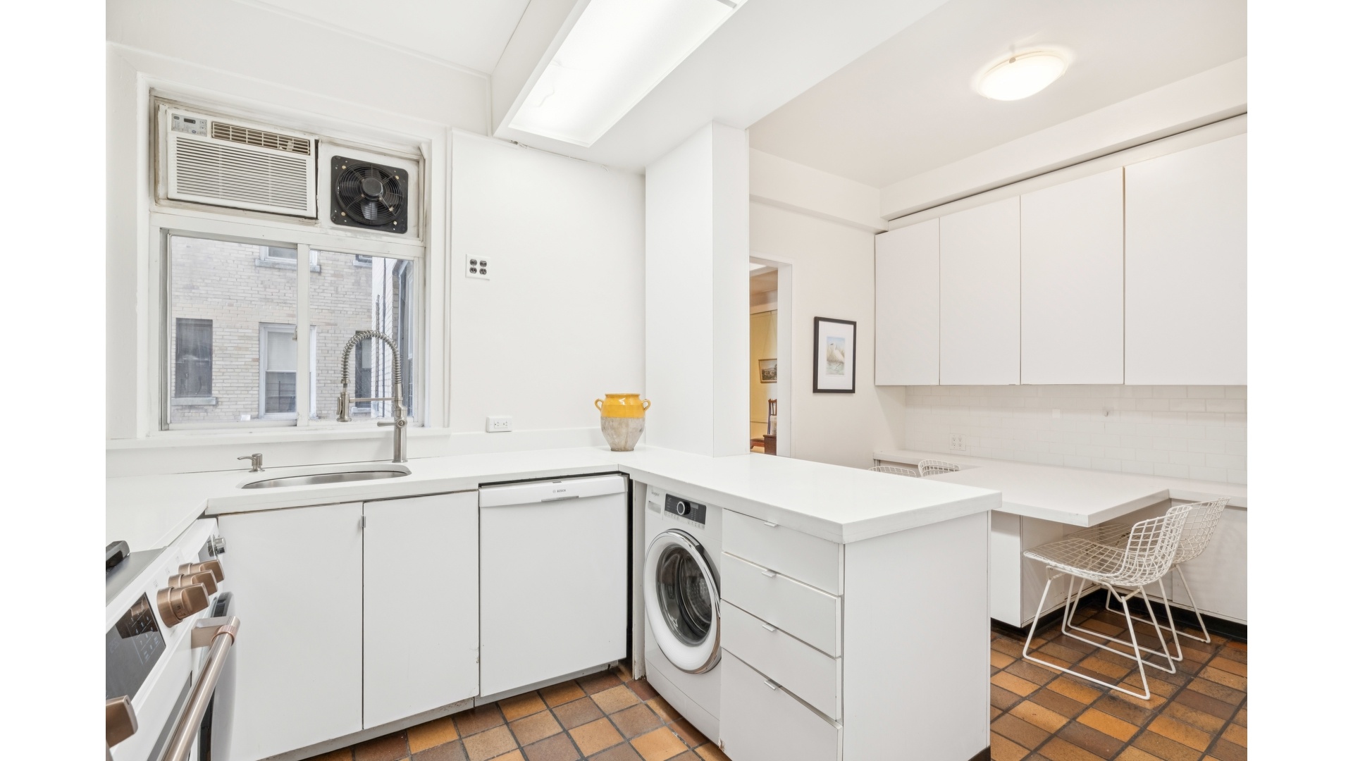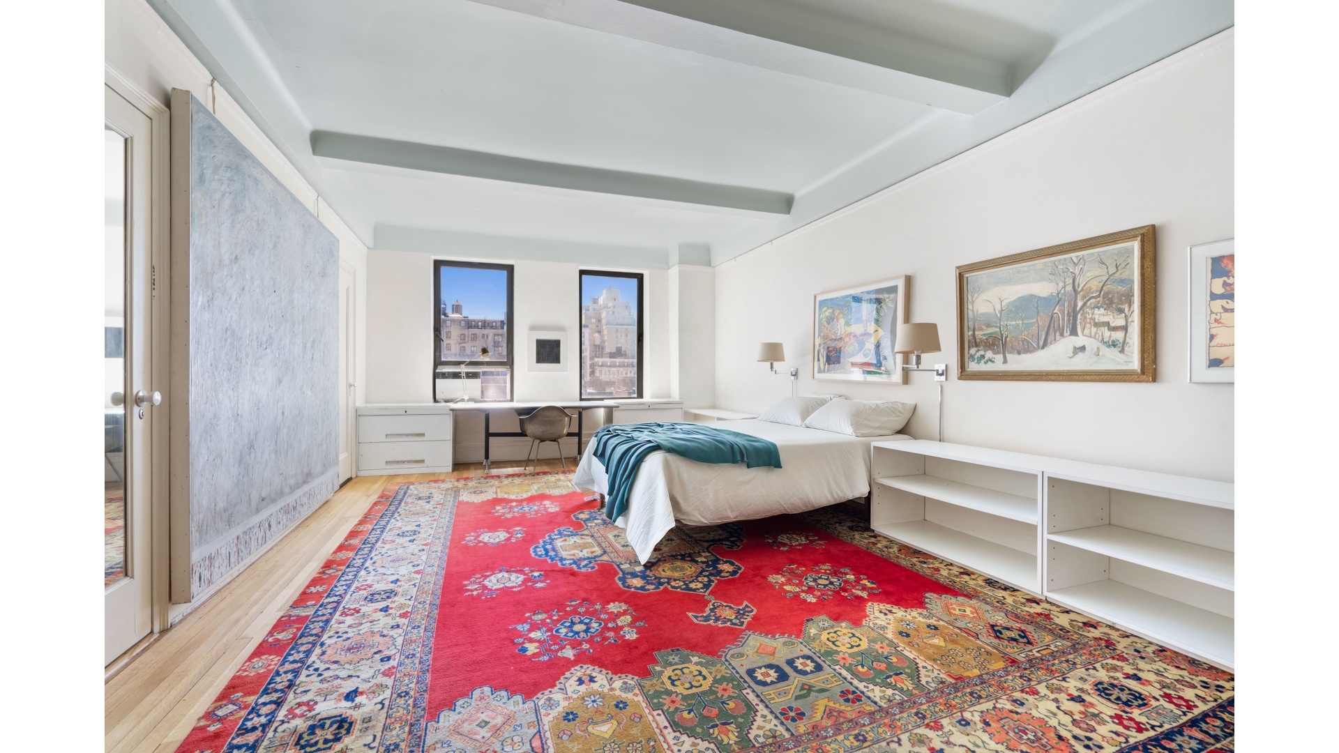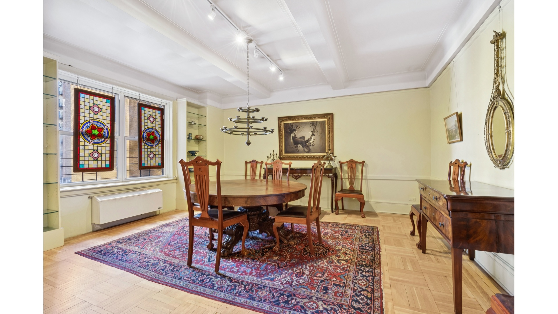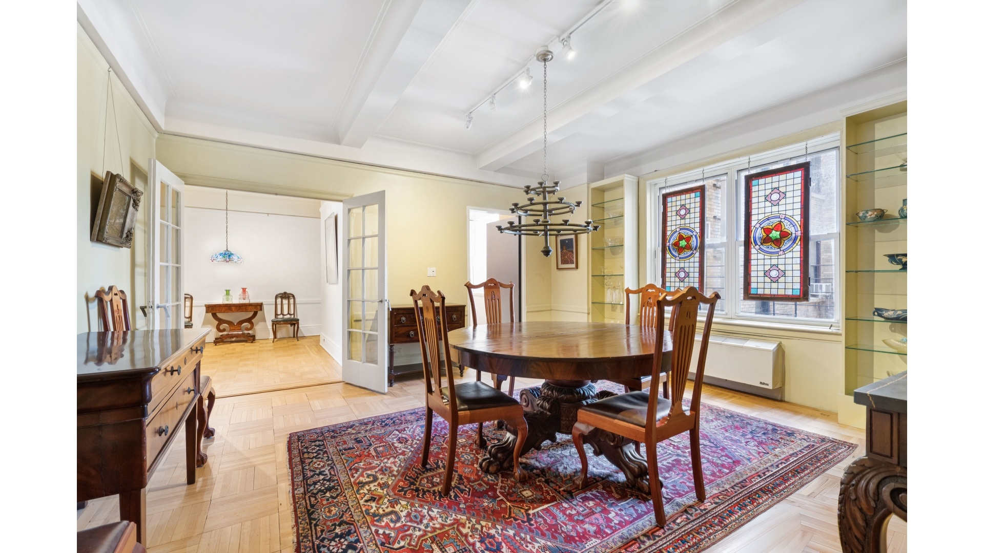 Additional highlights include oversized closets, classic beamed ceilings, rich parquet floors, and the convenience of an in-unit washer/dryer.