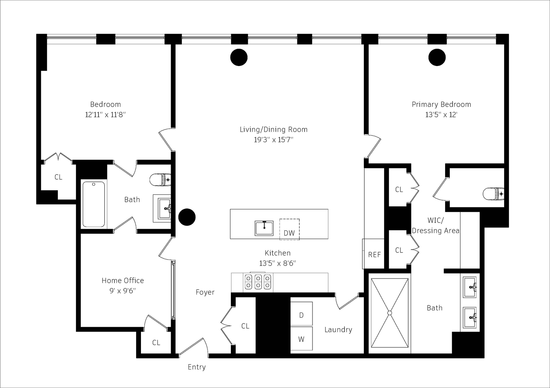 At opposite ends of the apartment are two large king-sized bedrooms with en-suite bathrooms. The primary enjoys a walkthrough closet and dressing area enroute to a luxurious bathroom with double sink vanity and large walk-in shower. There is a separate private closet for the commode. The 2nd bedroom is nearly the same size with a deep closet and a bathtub that jack-and-jills into the 3rd room. While the apartment is a legal two bedroom, the size of the 3rd room and wall of windows makes it endlessly versatile.