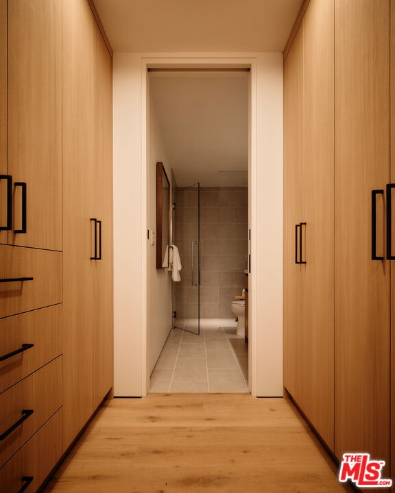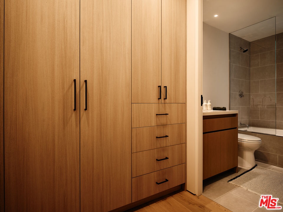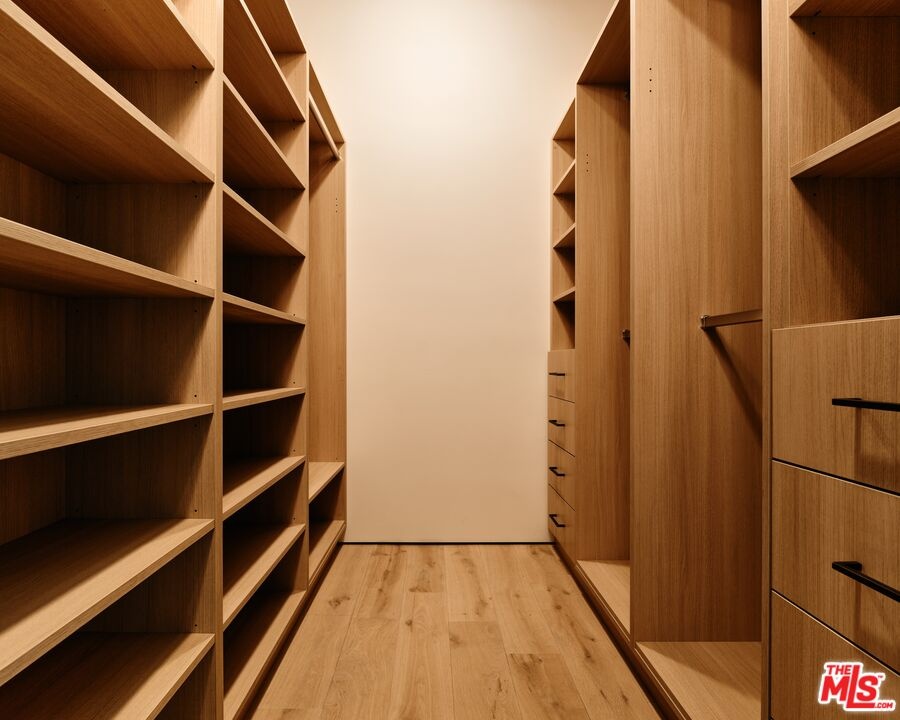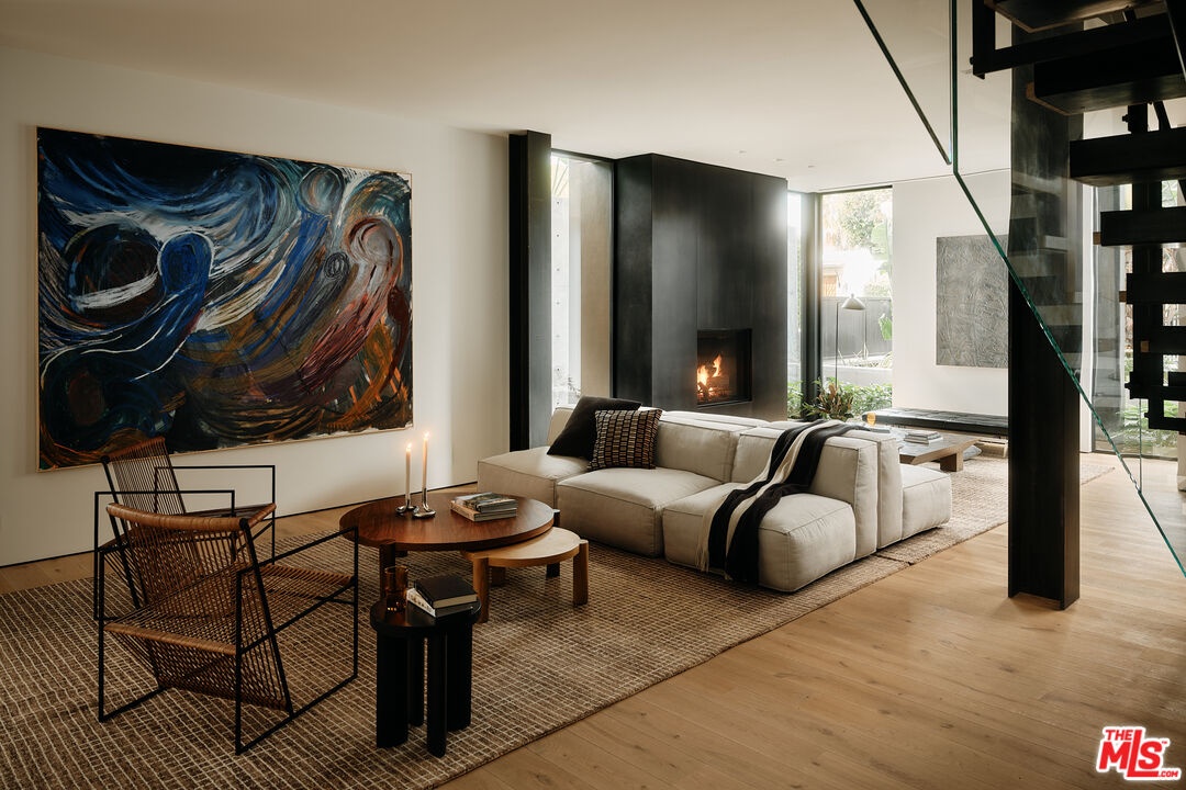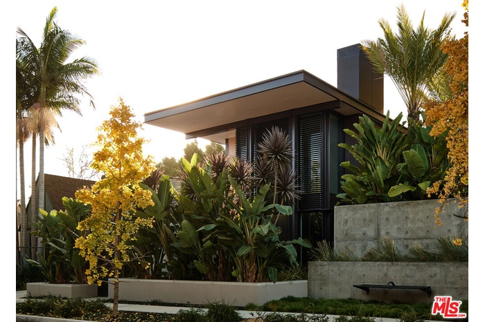 Concrete House at 8899 Beverly |Part of a limited collection of eight standalone residences at 8899 Beverly, Concrete House is an architecturally significant and recognizable work by Olson Kundig, defined by a monolithic expression of site-cast concrete set behind dense tropical foliage. A dramatic double-height entry reveals a floating open-riser staircase set against the central concrete wall. Exposed structural steel, a cantilevered roof, Fleetwood glazing, and fixed steel screening panels complete the composition, filtering light and providing privacy while framing the surrounding tropical landscape and glimpses of the Hollywood Hills. The home spans 2,962 square feet, with three bedrooms and three-and-a-half bathrooms. The living area is anchored by a fireplace beneath exposed steel beams, with white oak floors running throughout. The kitchen is appointed with Miele and Gaggenau appliances, rift-cut oak cabinetry, and Dornbracht fixtures. All three bedrooms include built-out closets and ensuite baths. The primary suite is detailed with a bedside fireplace framed by windows which offer peekaboo views of the Hollywood Hills. Multi-panel doors connect the living and dining areas to a private outdoor space with a 32-foot plunge pool and spa, surrounded by tropical landscaping. Residents of 8899 Beverly have access to 24-hour concierge and property management, a fitness center, and an amenity deck with resort-style pool, spa, and outdoor kitchen. One of only four remaining homes in the collection, Concrete House offers a rare opportunity to own a fully private, architecturally significant residence with the services and amenities of 8899 Beverly, combining the privacy of a single-family home with the ease of fully serviced living.